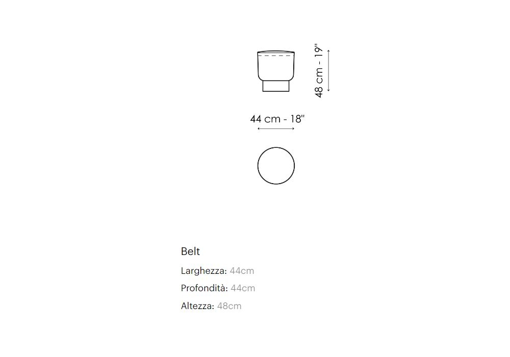Belt conçu par Alain Gilles pour Bonaldo est un pouf avec structure interne en bois, rembourrage en polystyrène expansé et doublure interne en velours. La housse est amovible et disponible en différents tissus et couleurs. La base est en métal peint, en différentes finitions.