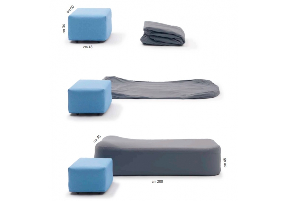 Jet conçu par Giulio Manzoni pour Campeggi est un pouf/chariot. Conçu comme un pouf sur roulettes qui contient un seul lit gonflable pouvant être transporté comme un chariot souple. Matelas PVC.