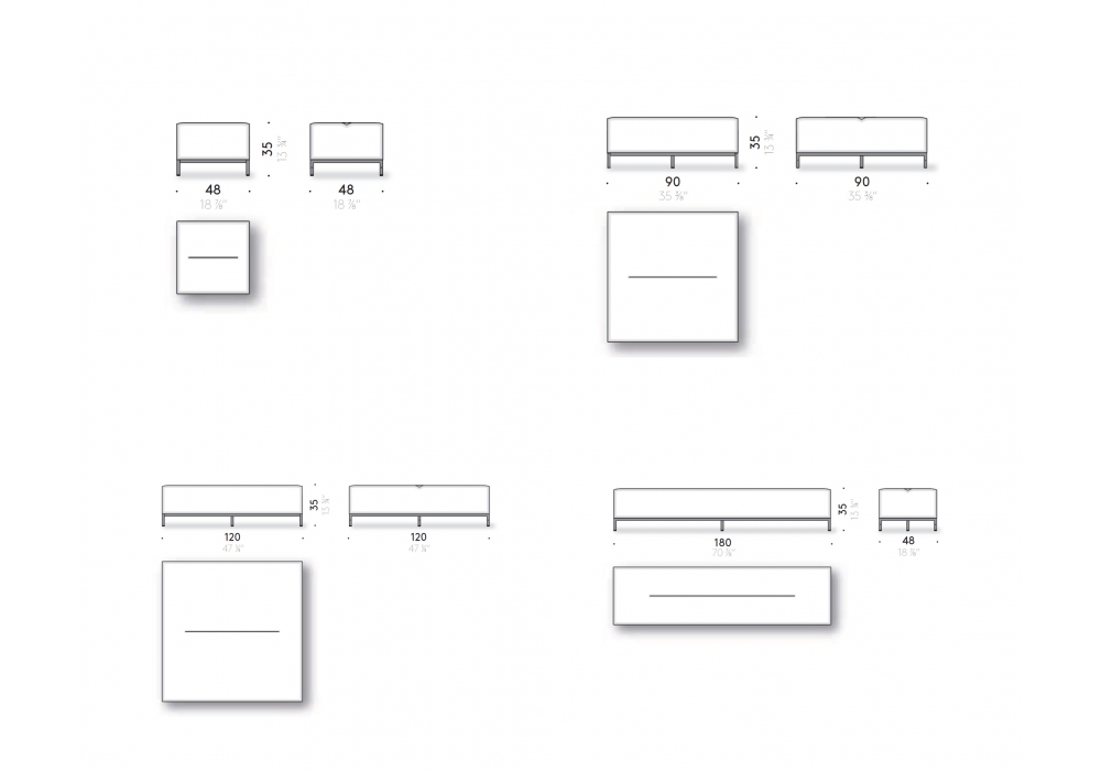 | Dimensions | 48 x 48 x H 35 cm; 90 x 90 x H 35 cm; 120 x 120 x H 35 cm; 180 x 48 x H 35 cm. |