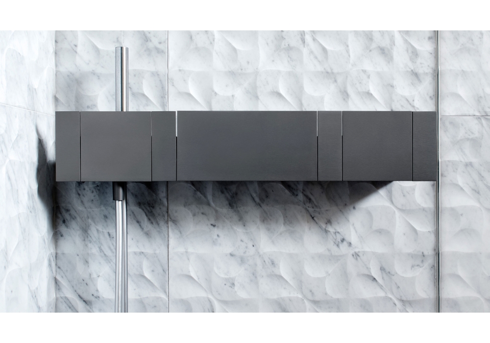 Sen conçu par Gwenael Nicolas, Curiosity pour Agape est une commande murale pour douche de tête ou pour bec d’écoulement baignoirenoir en aluminium anodisé brossé avec finition noir.
