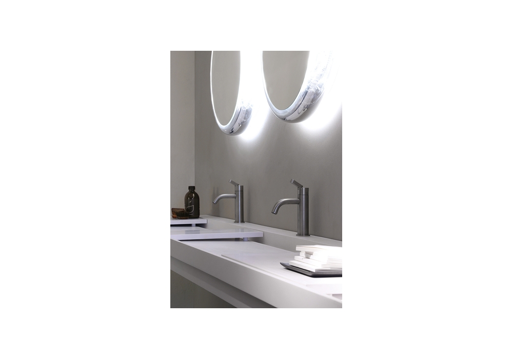 Square, conçu par Benedini Associati pour Agape, est un mitigeur monotrou en acier inoxydable AISI316L poli ou satiné. Equipé de flexibles d'alimentation.