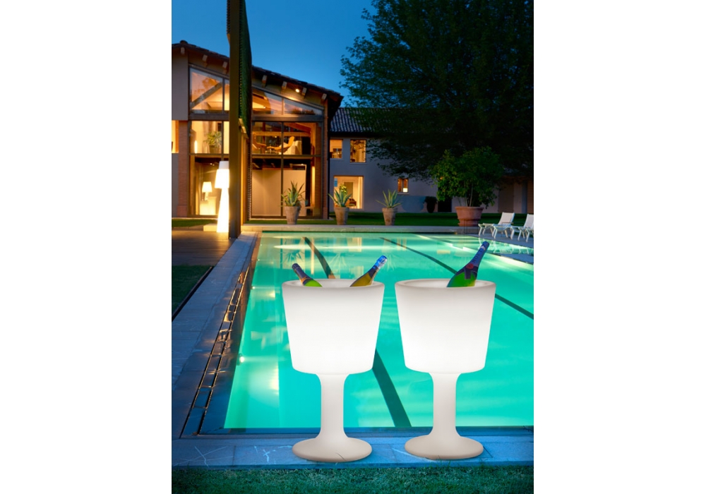 Light Drink conçu par Jorge Nàjera pour Slide est un casier à bouteilles illuminé réalisé en polyéthylène par rotomoulage. Light Drink est une lampe d’ambiance mais peut être aussi utilisé comme un original porte-bouteille / bac à glace. Créée par Jorge Najera, en forme de verre, elle peut être utilisée à l’intérieur comme à l’extérieur. Light Drink est disponible seulement en blanc. Léger et facilement transportable, Light Drink peut être équipée avec un LED RGB sans câble.