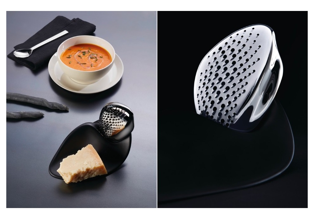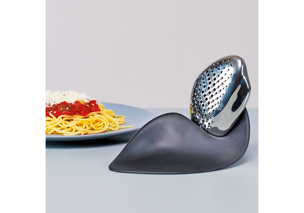 Forma conçue par Zaha Hadid pourAlessi est une râpe à fromage en acier inox 18/10 brillant avec base en mélamine.