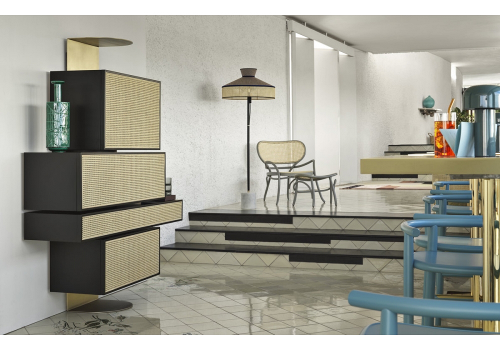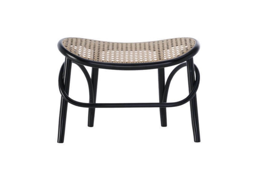 Lehnstuhl Hocker conçu par Nigel Coates pour Gebrüder Thonet Vienna est un repose-pieds en hêtre courbé disponible en différentes finitions, assise en paille de Vienne à mailles larges.