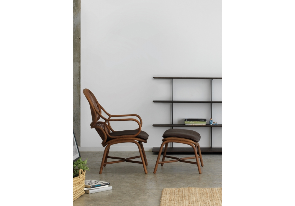 Huma conçu par Mario Ruiz pour Expormim est un petit fauteuil réalisé avec structure et dossier en rotin naturel coloré, base pivotante en métal. Assise rembourrée. Disponible en différentes finitions.