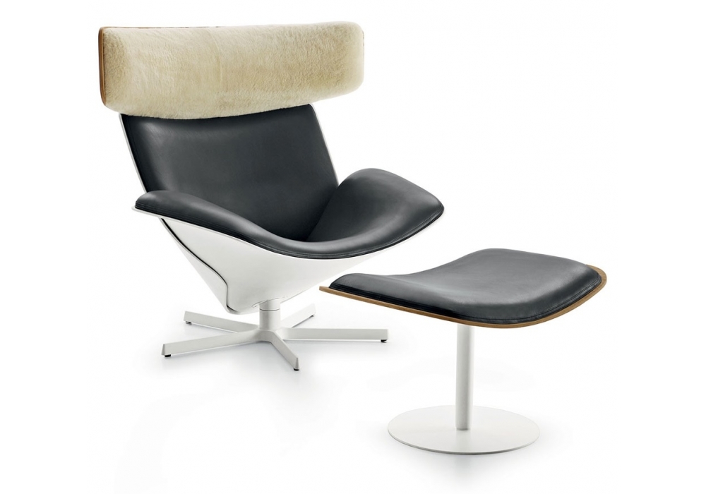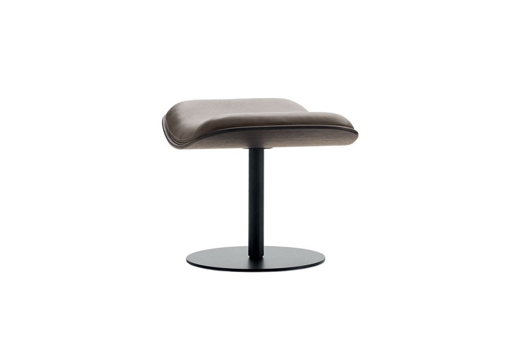 Almora conçu par Nipa Doshi & Jonathan Levien pour B&B Italia est un repose-pieds avec structure en aluminium peint blanc ou noir. Coque en chêne gris, chêne clair brossé, chêne noir brossé ou chêne teinté fumé. Revêtement du siège en cuir.