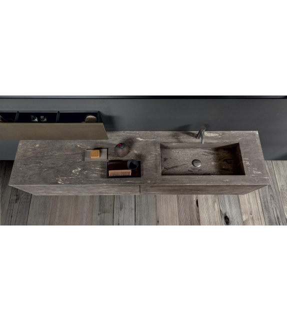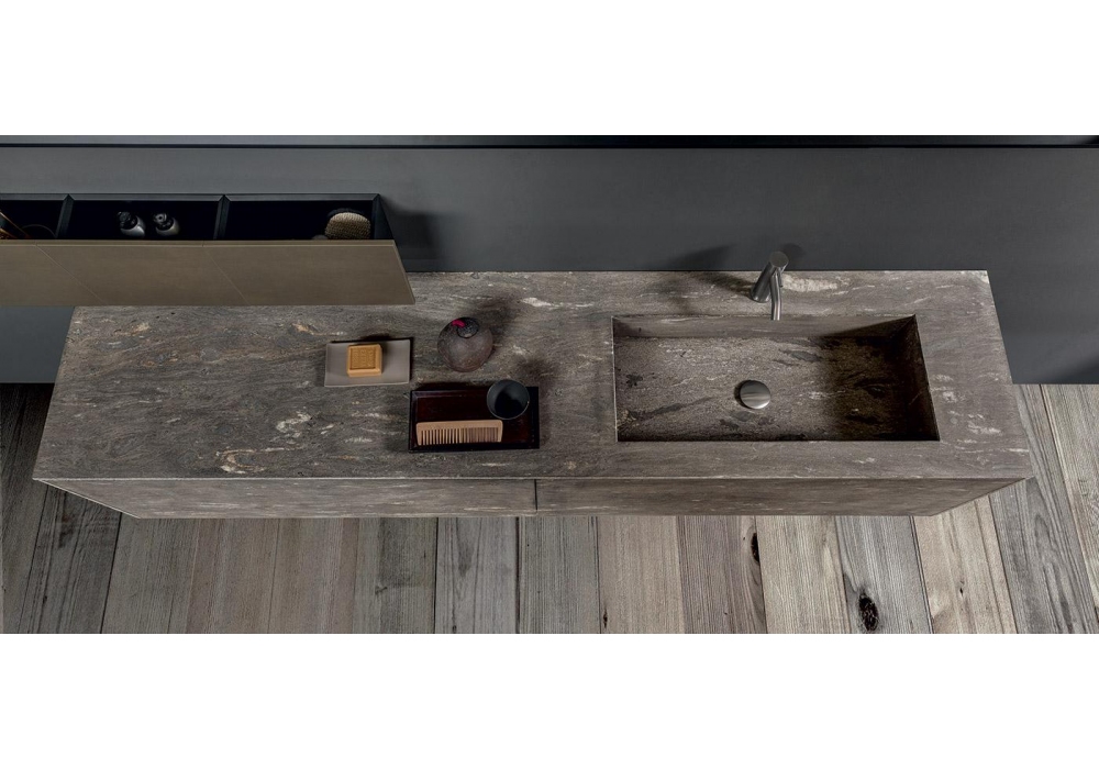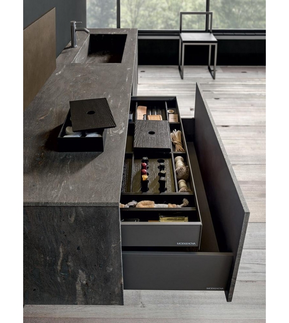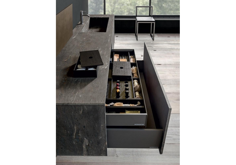 Blade Lab conçu et produit par Modulnova est un système de salle de bain avec des détails technologiques et fonctionnels, grâce à la structure en pierre finement travaillée, ce qui le rend très confortable à utiliser. Il peut être réalisé en marbre, granit et autres matériaux naturels, travaillés avec des techniques innovantes et élégantes. Le miroir a un cadre en métal qui donne de la légèreté à la composition. Les accessoires internes des tiroirs permettent une excellente organisation des espaces. Contactez notre service client pour configurer votre système de salle de bain Blade Lab selon vos préférences.