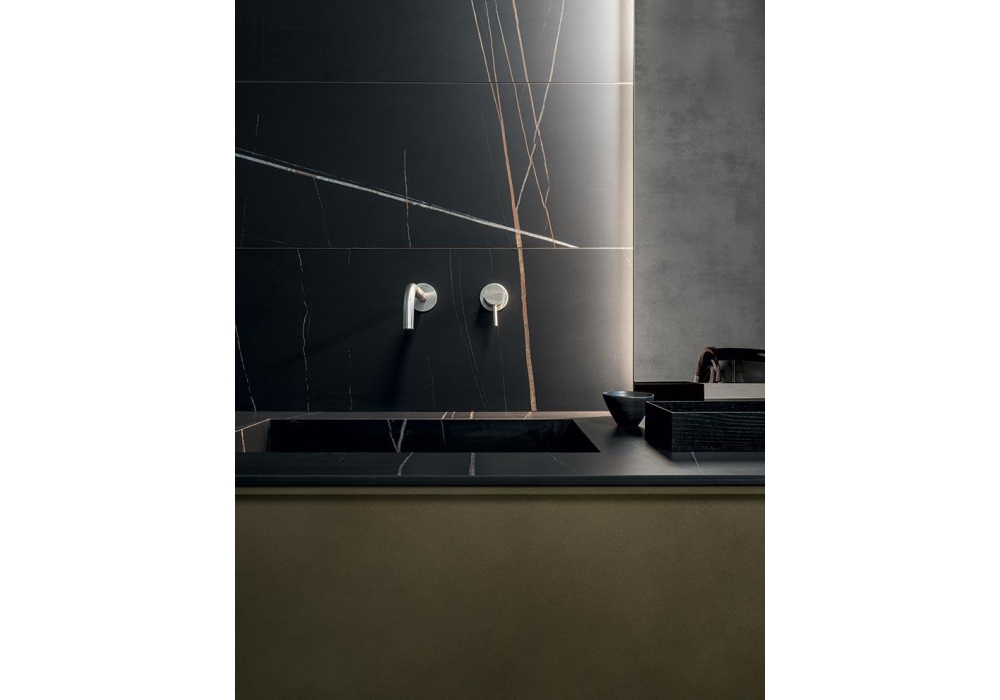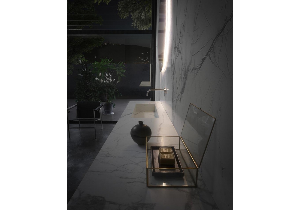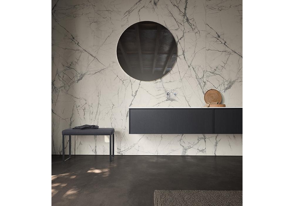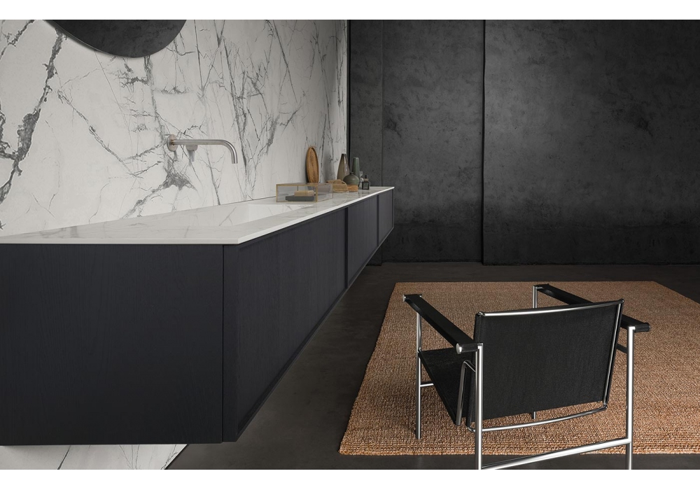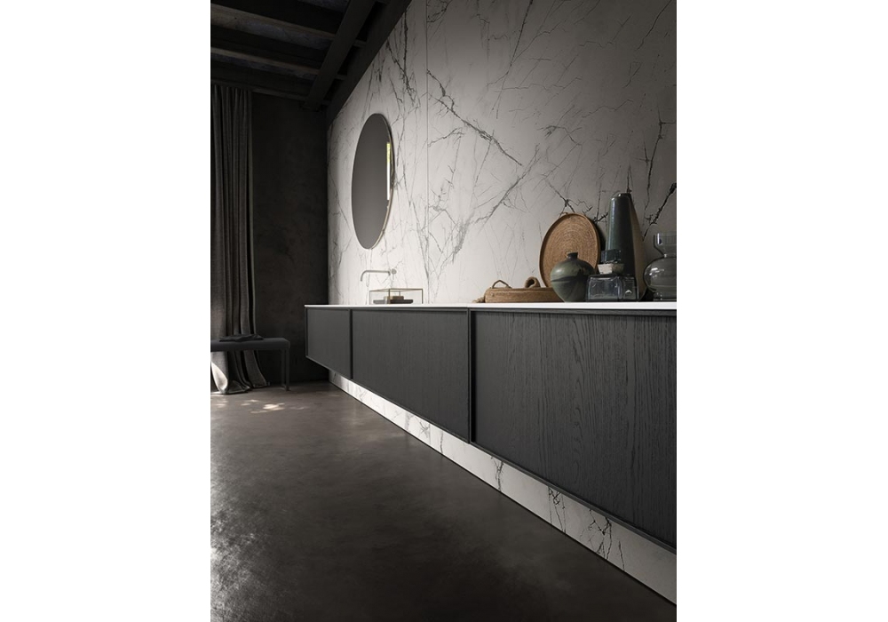 Frame conçu et produit par Modulnova est un système de salle de bain aux lignes essentielles qui fait ressortir le profil de la porte du conteneur suspendu : la poignée est encastrée dans l'épaisseur et est cachée à la vue. L'habillage mural en grès de Carrare contraste les tons sombres du meuble de rangement, le grand miroir rond rétroéclairé est élégant et fonctionnel. Le système peut également être réalisé avec une finition métallique ou dans d'autres matériaux, avec des solutions d'éclairage sur mesure, parfaites pour chaque besoin. Vous pouvez configurer Frame comme vous le souhaitez : contactez notre Service Client.