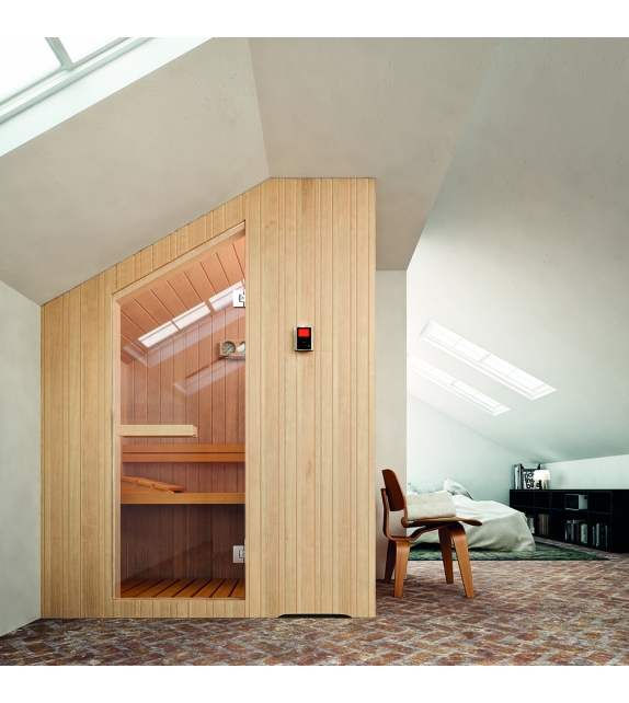 Nuvola conçu par Glass Lab est un sauna finlandais. Poêle avec pierres et protection en bois, bancs, caillebotis, éclairage interne, sablier, hygromètre, thermomètre. Programmation de l'allumage, contrôle et gestion du temps et de la température, on/off éclairage, gestion de l'humidité. Verres fumé et chromothérapie LED en option.