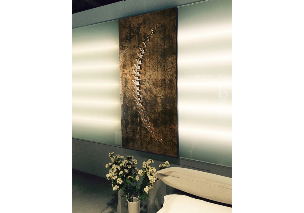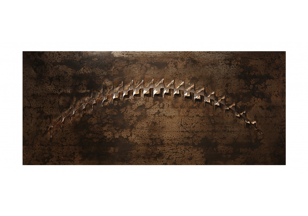 Lisca conçue par Faravelli & Guadalupi pour FG Art and Design est une sculpture murale en fer au fini gravé. Le dessus en fer est travaillé à travers un processus totalement fait à la main, chaque coupe du dessus est soigneusement pliée à la main pour composer le design final.