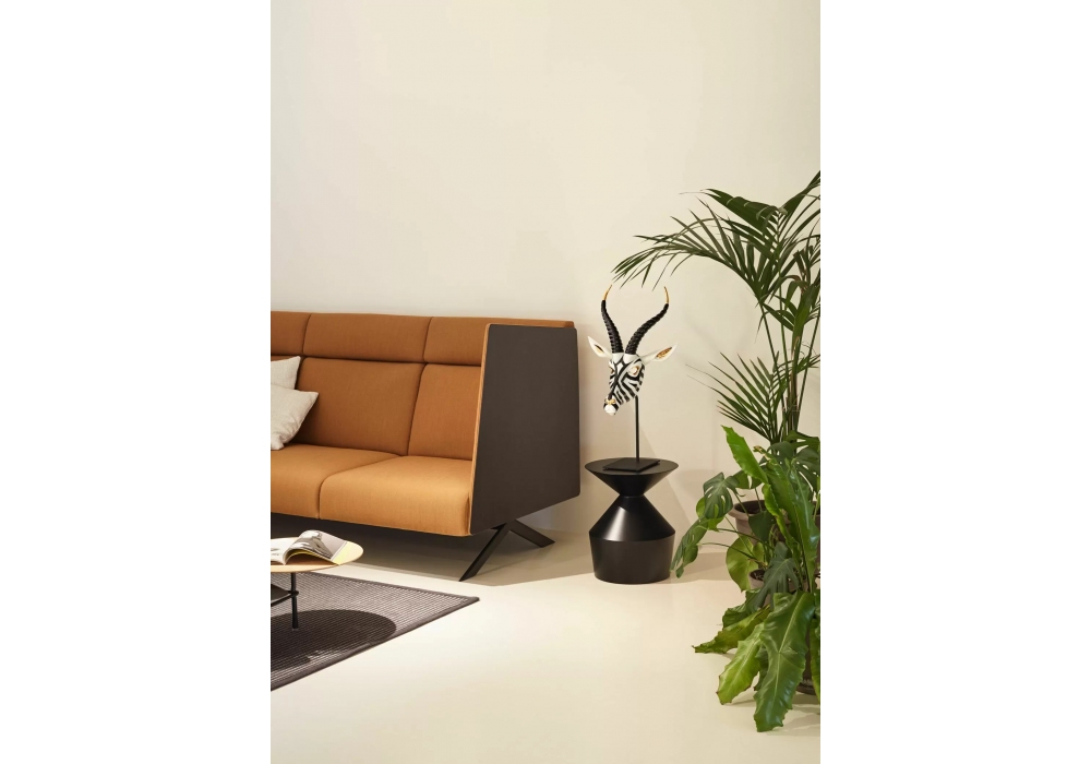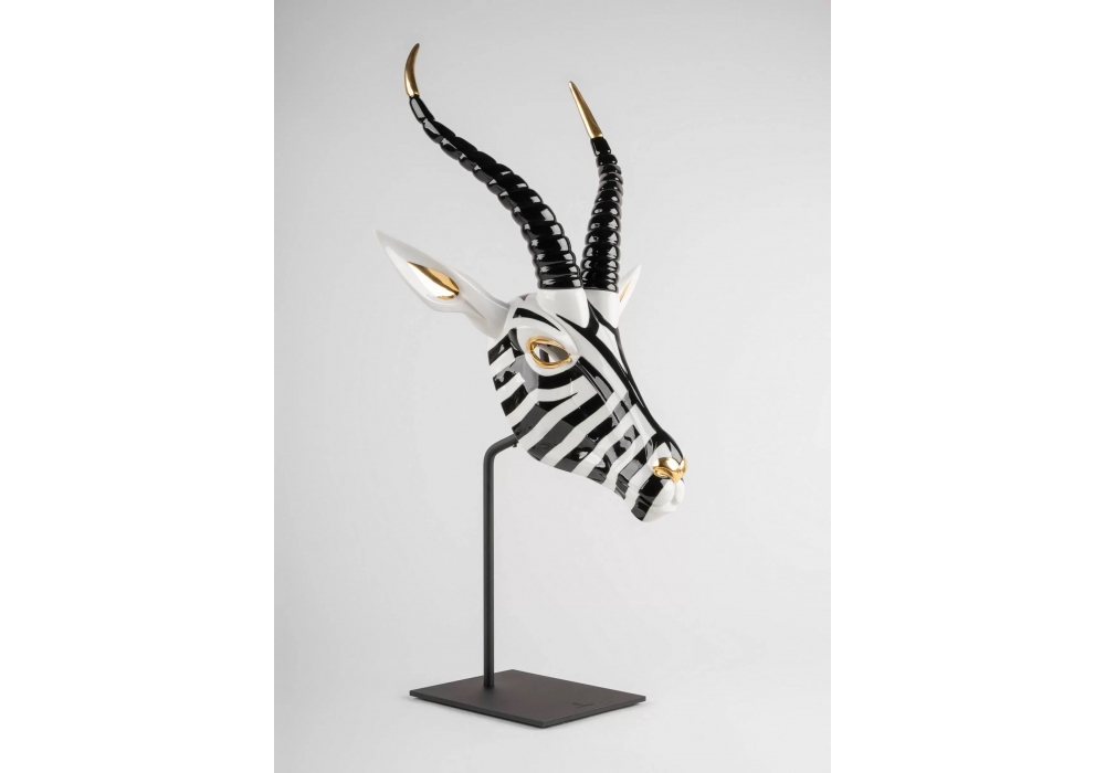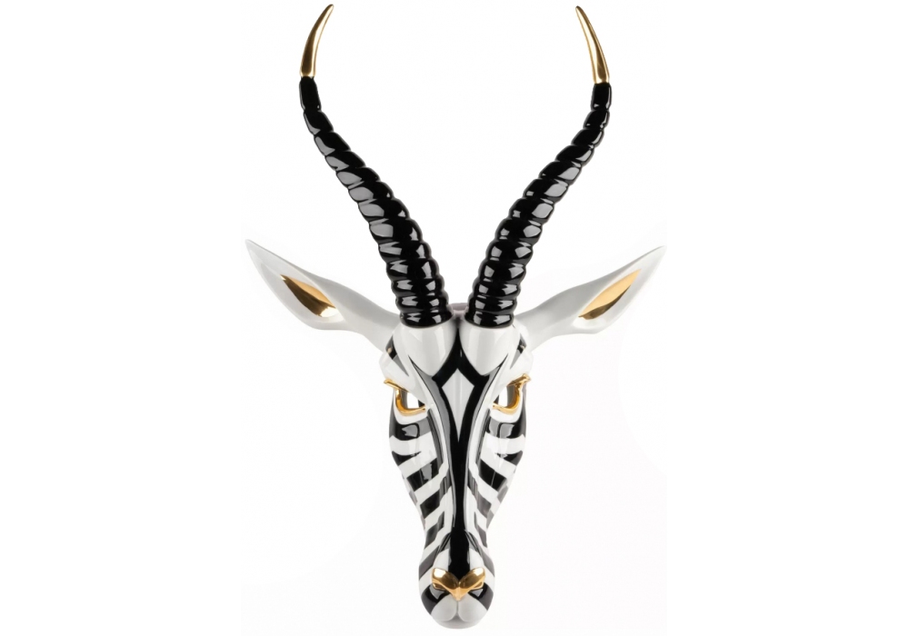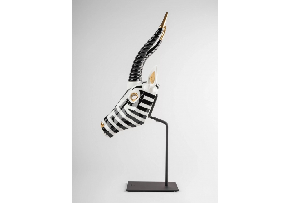 Maschera Antilope sculptée par José Luis Santes pour Lladró est une sculpture en porcelaine brillante noire, blanche et or, entièrement réalisée et peinte à la main par les artistes Lladró.