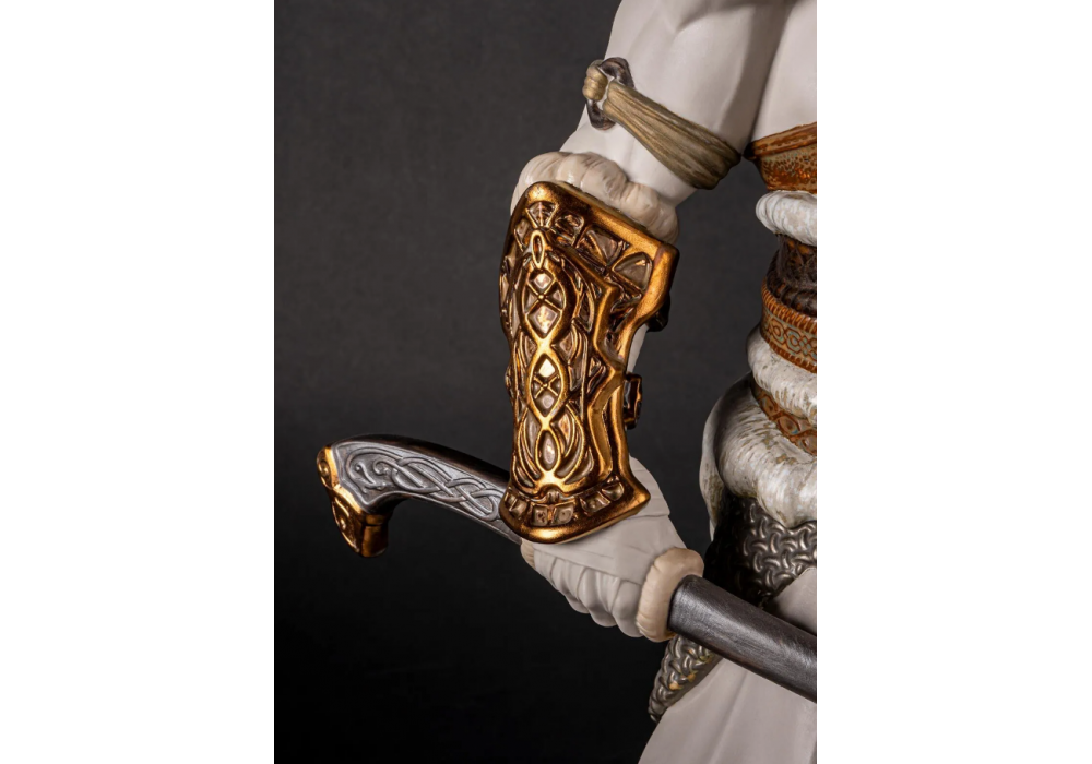 Odin sculpté par José Santaeulalia pour Lladró est une sculpture en porcelaine blanche mate représentant un dieu de la mythologie nordique. Les armes et les détails sont en ocre, argent et or.