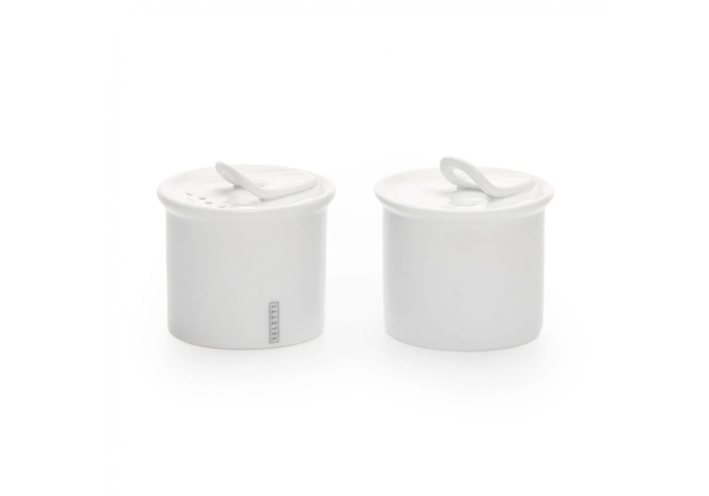 Estetico Quotidiano conçu par Selab & Alessandro Zambelli est un ensemble de récipients cylindriques en porcelaine composé d'une salière et d'une poivrière.