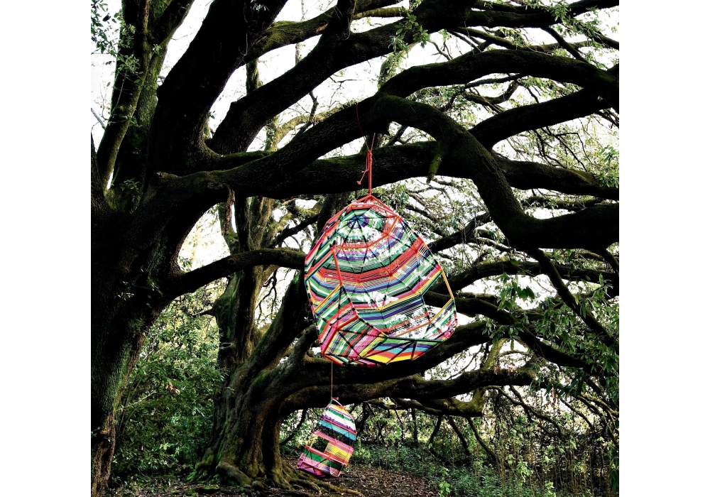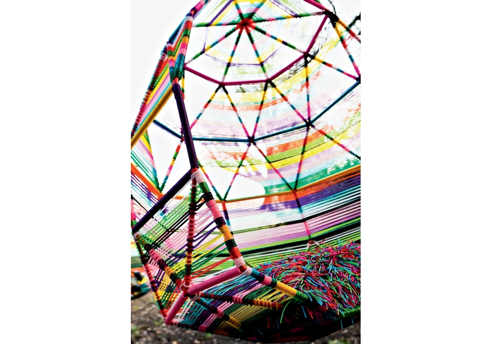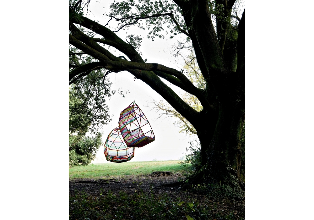 Tropicalia est un Cocoon avec cinq coussins conçu par Patricia Urquiola pour Moroso. Structure en acier verni rouge, RAL 3020, et tissage de fils de polymère technique multicolore ou naturel.