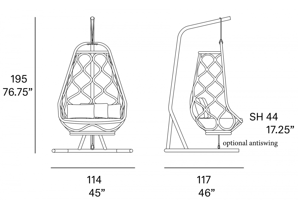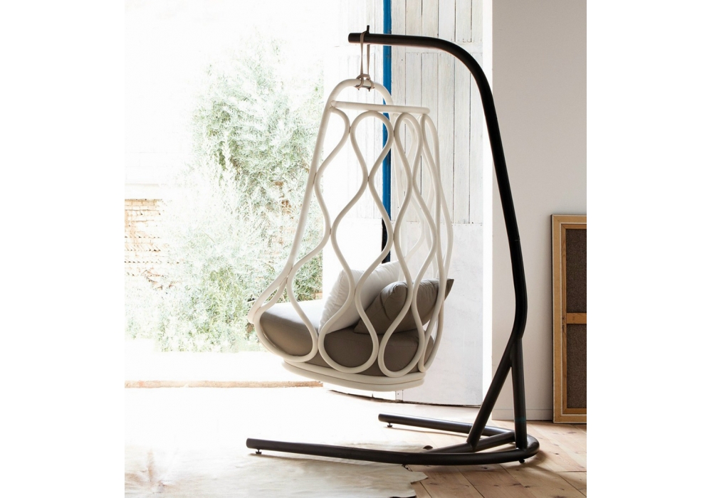 Nautica Outdoor conçu par Mut Design pour Expormim est un fauteuil suspendu fabriqué en tube d'aluminium haute résistance. Structure et base disponibles en différentes finitions.