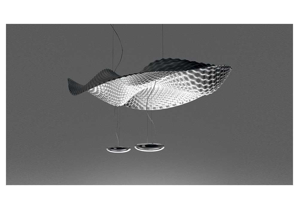 Cosmic Angel conçue par Ross Lovegrove pour Artemide est une lampe à suspension avec corps lampe/réflecteur en matériau thermoplastique tandis que le diffuseur supérieur est en méthacrylate opale. Les corps d'éclairage sont en aluminium moulé sous pression et abritent des sources lumineuses LED à intensité variable.