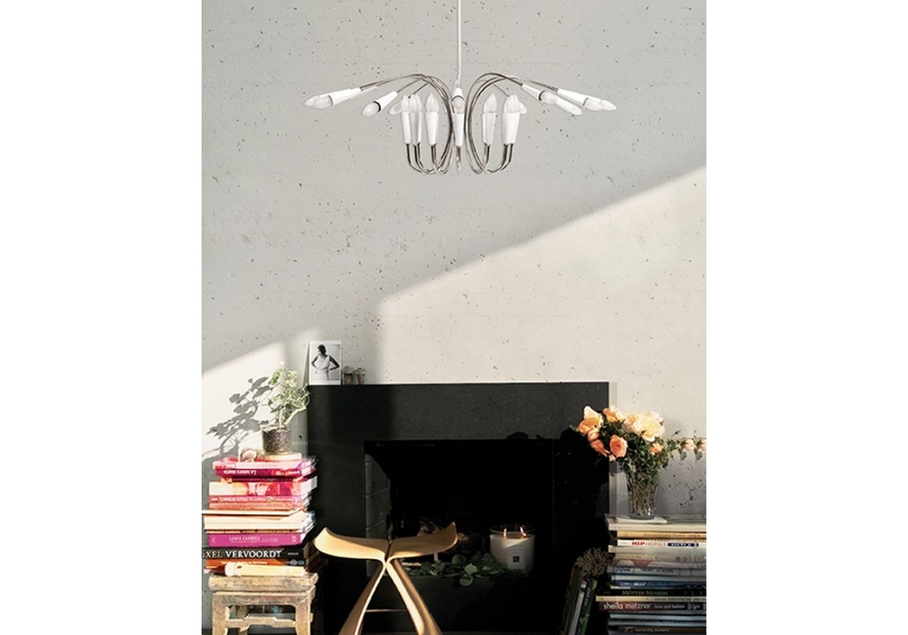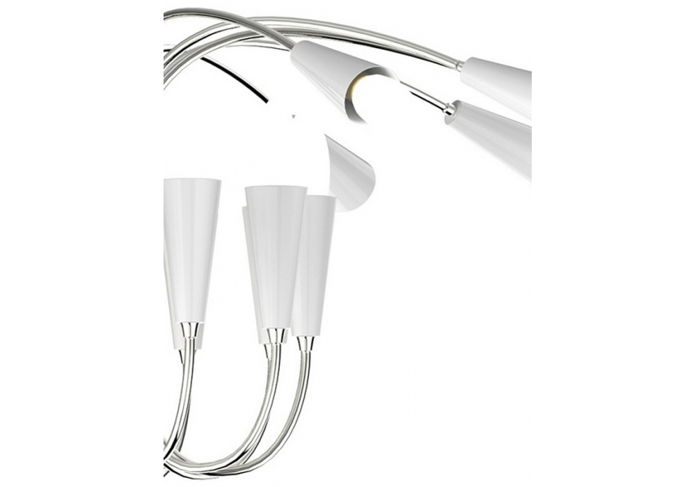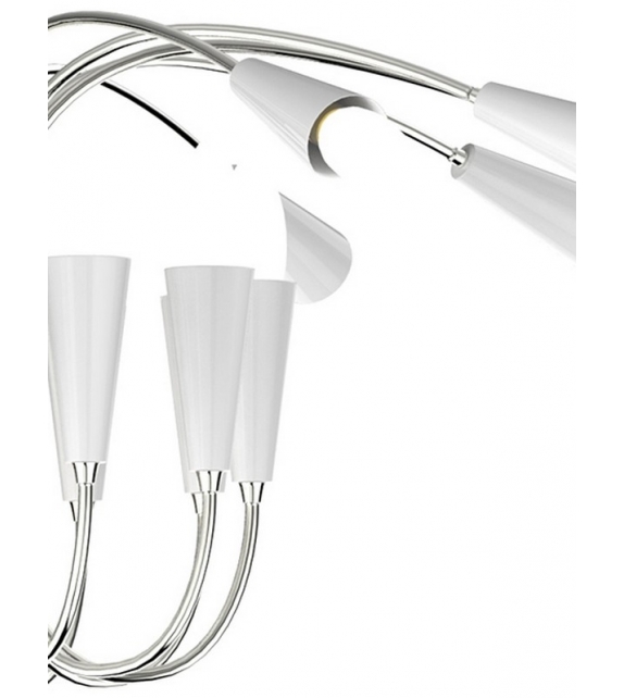 Aretha conçue par DelightFULL est une lampe à suspension avec structure faite à la main en laiton nickelé et douille en aluminium blanc brillant. Permet une utilisation alternative des lumières : haut, bas ou les deux.