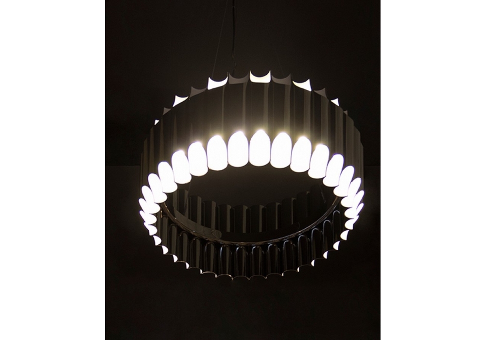 Galliano Round conçu par DelightFULL est une lampe à suspension fabriquée à la main en acier, les caractéristiques comprennent une finition nickelée artisanale. L'intérieur des abat-jour est en blanc mat.