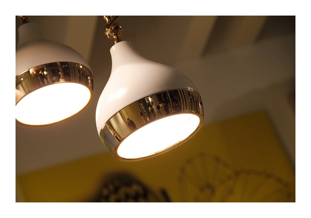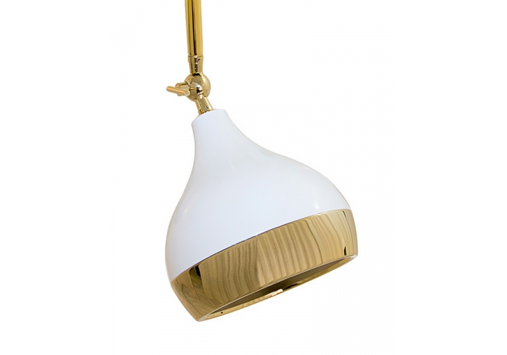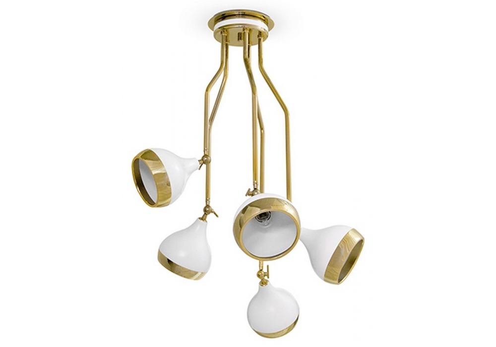 Hanna Ceiling conçue par DelightFULL est une lampe à suspension fabriquée à la main en laiton, elle a cinq bras avec des abat-jour en forme de cloche, qui peuvent être ajustés pour rediriger la lumière.