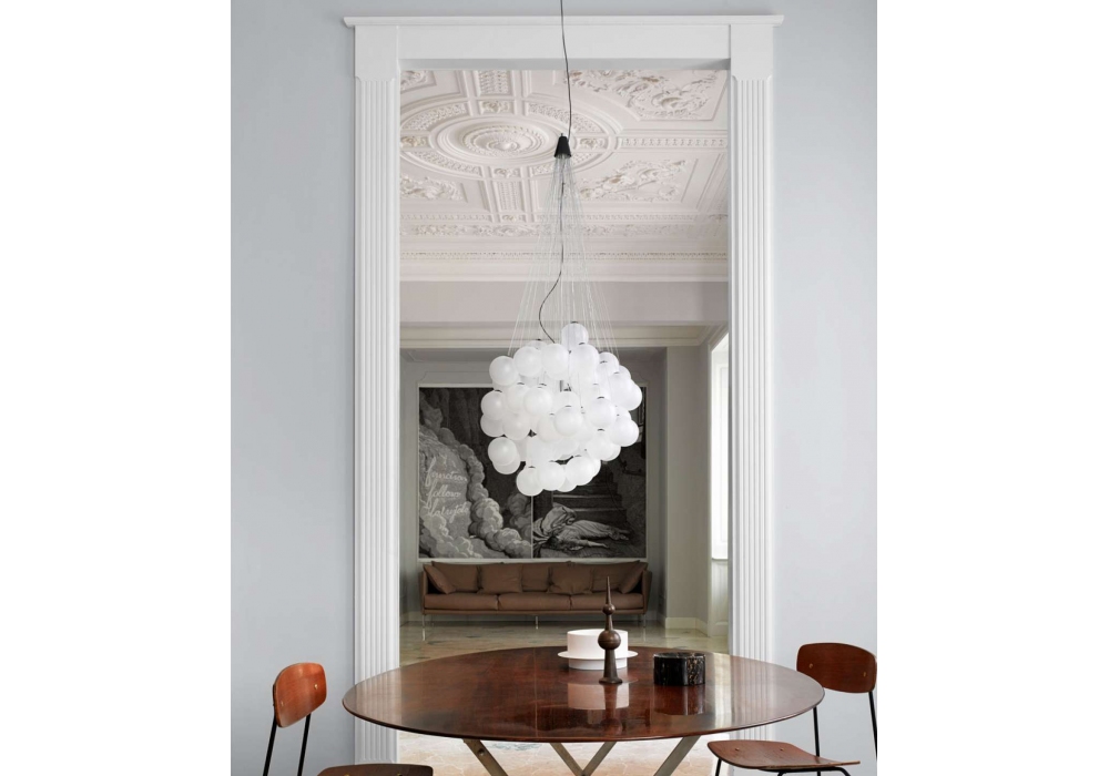 Stochastic conçue par Daniel Rybakken pour Luceplan est une suspension avec tiges en acier inoxydable et sphères en verre soufflé blanc opale. Disponible en version 48 ou 72 billes.