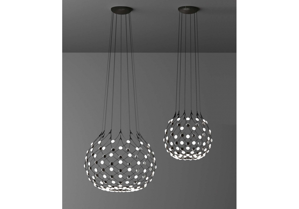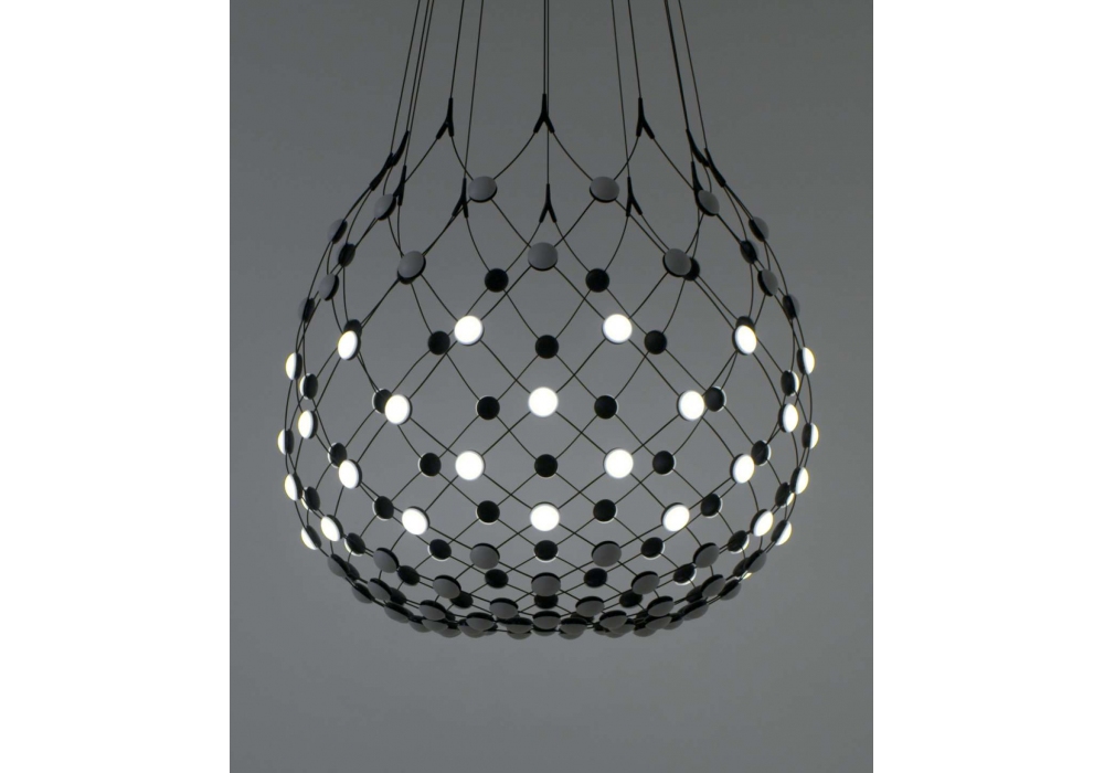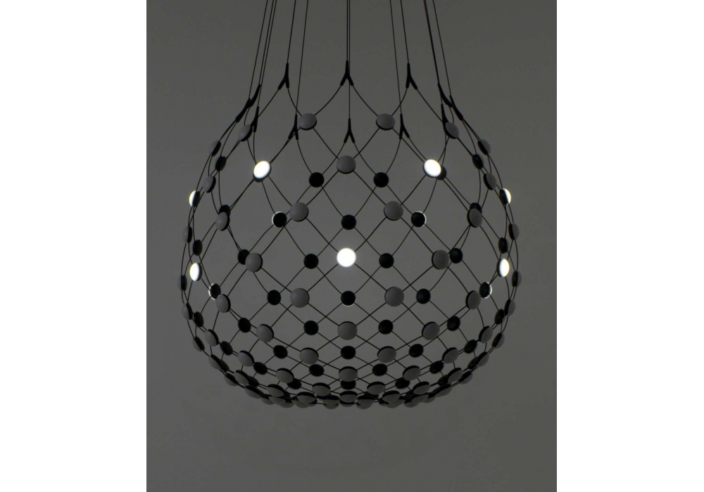 Mesh conçue par Francisco Gomez Paz pour Luceplan est une suspension avec structure en acier noir et lentilles en polycarbonate. L'éclairage est contrôlé par un variateur à coupure de phase ou sans fil, via une application spéciale qui vous permet d'activer / désactiver l'allumage programmé à distance. Disponible en différentes versions et dimensions.