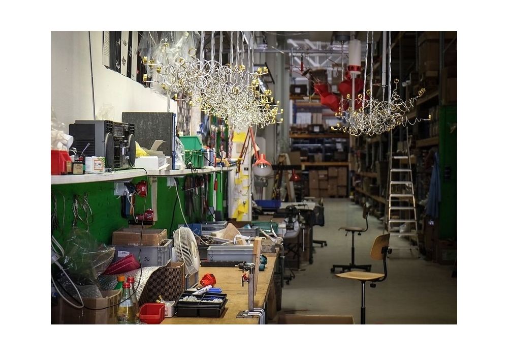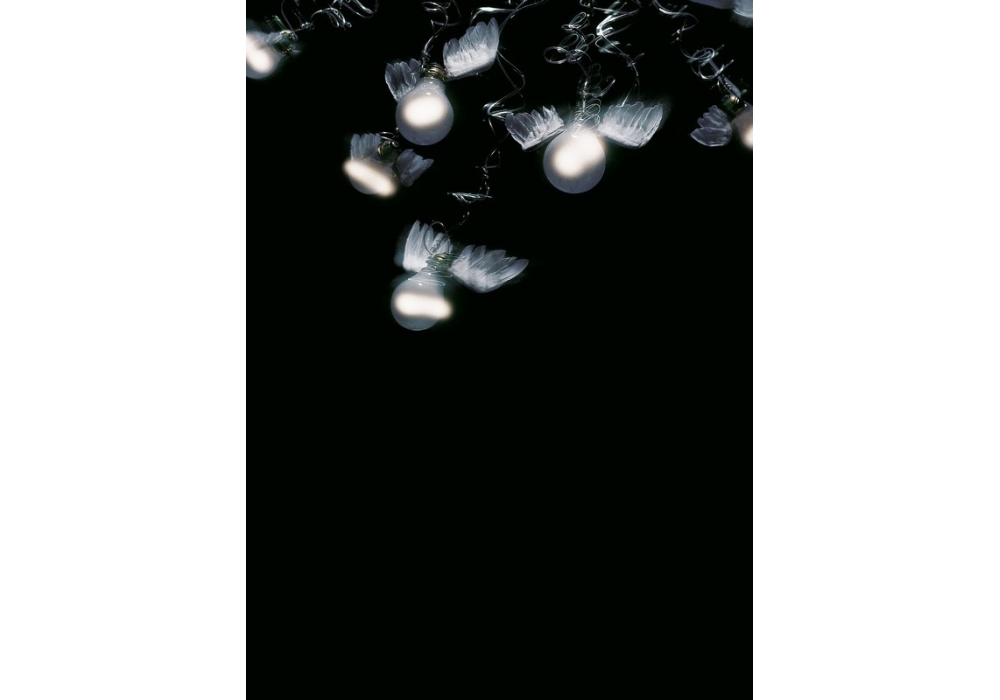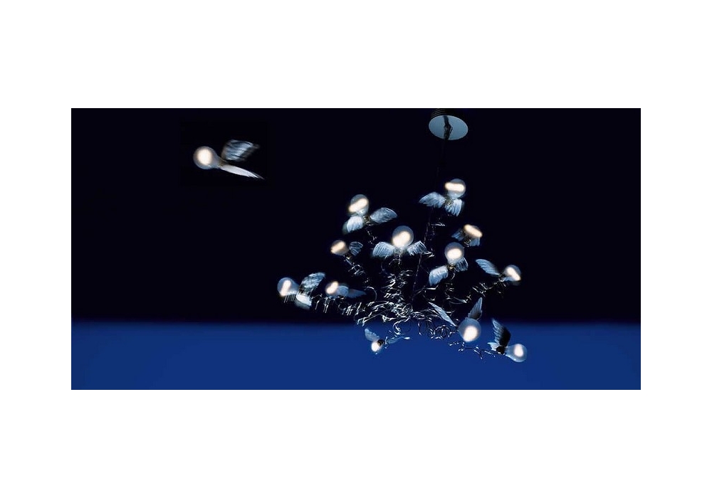 Birdie conçue et produite par Ingo Maurer est une lampe à suspension avec 12 ampoules LED, structure en métal et application d'ailes en plumes d'oie. Les câbles sont disponibles en couleur rouge ou transparente.
