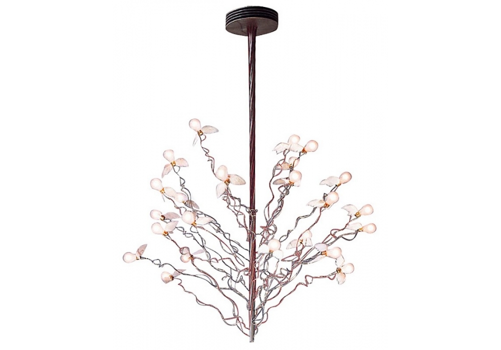 Birds Birds Birds conçu et produit par Ingo Maurer est une lampe à suspension avec 24 ampoules LED ailées avec des plumes d'oie. Les ampoules sont réglables individuellement.