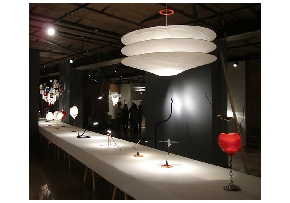 Floatation conçue et produite par Ingo Maurer est une lampe à suspension avec diffuseur en papier japonais, disponible en différentes tailles. Anneau en fer rouge pour le réglage en hauteur, rosace en métal peint en blanc.