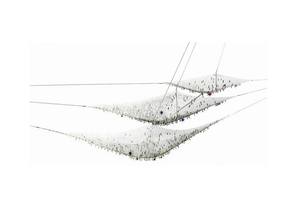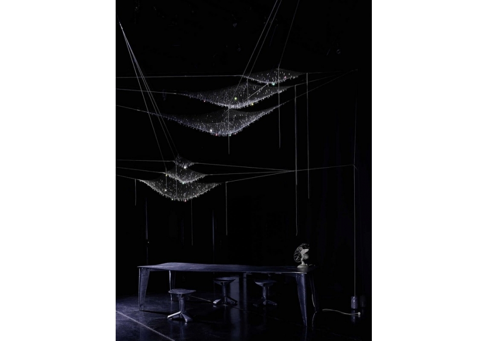 Lacrime Del Pescatore conçue et produite par Ingo Maurer est une lampe à suspension dont la structure est composée de 3 filets en nylon de différentes tailles, avec l'application de 385 cristaux. L'ampoule, Ø 11 cm, est fixée au mur séparément.