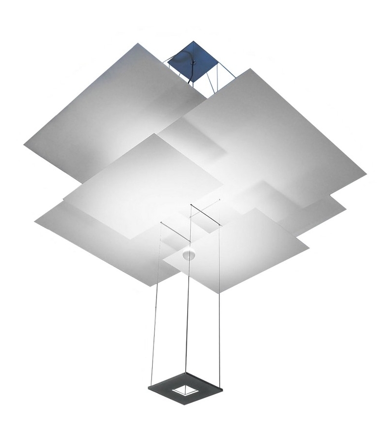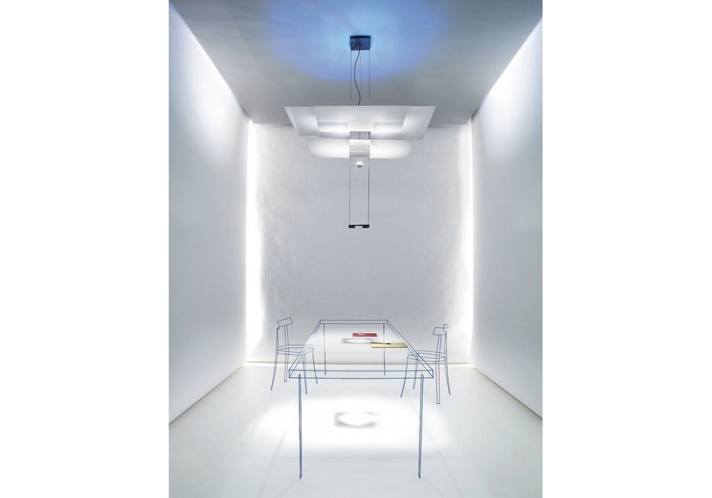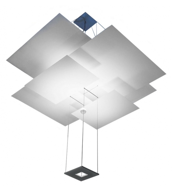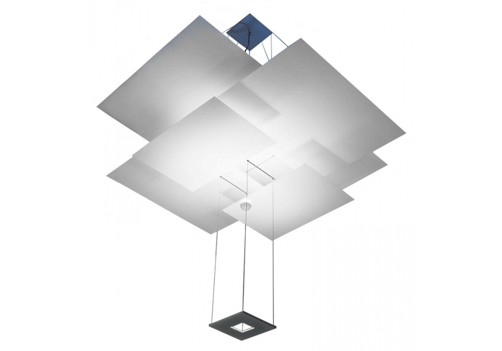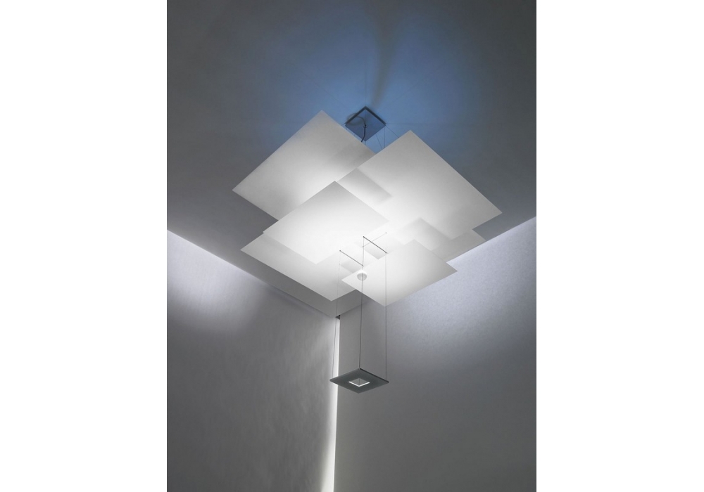 Oh Mei Ma Weiss est une suspension signé par Ingo Maurer. Métal, verre. Six feuilles en tôle d'aluminium, laquées blanc mat. Longueur spéciale 550 cm sur demande. Dimmable, livré avec LED intégrés.