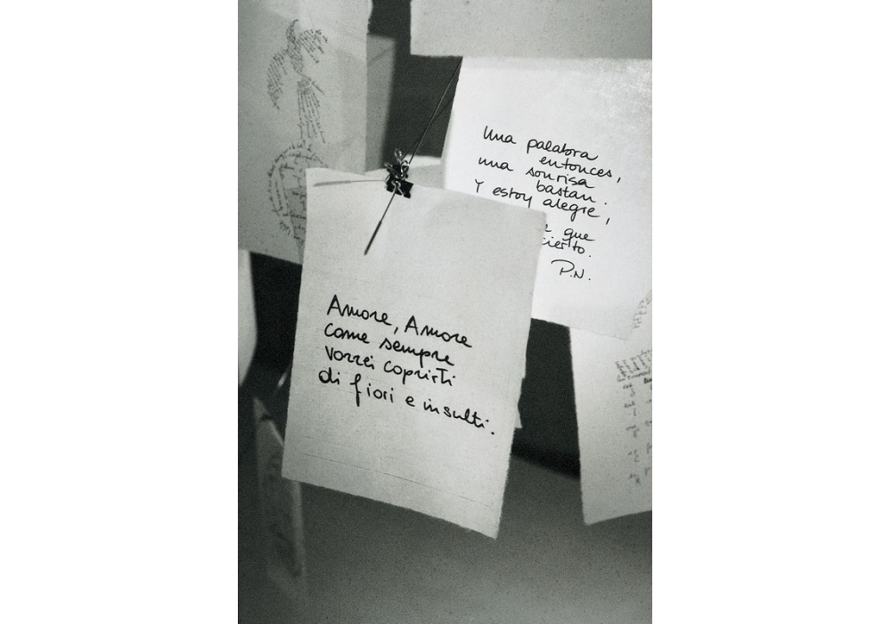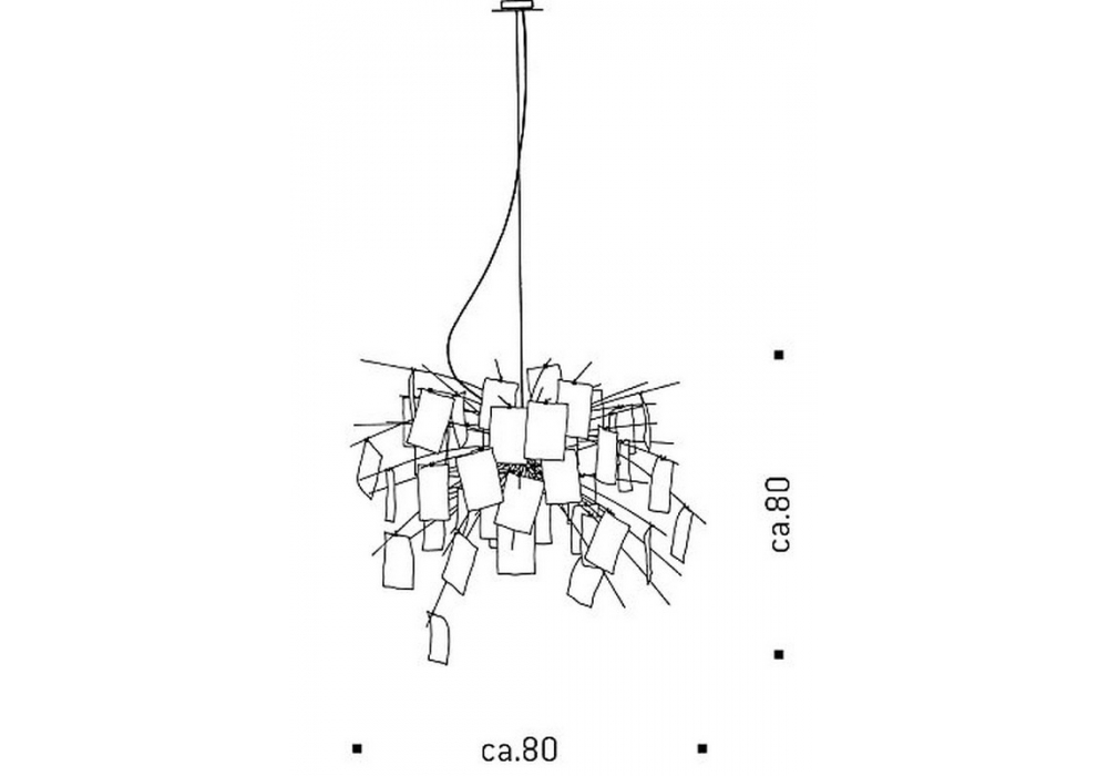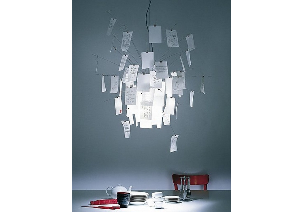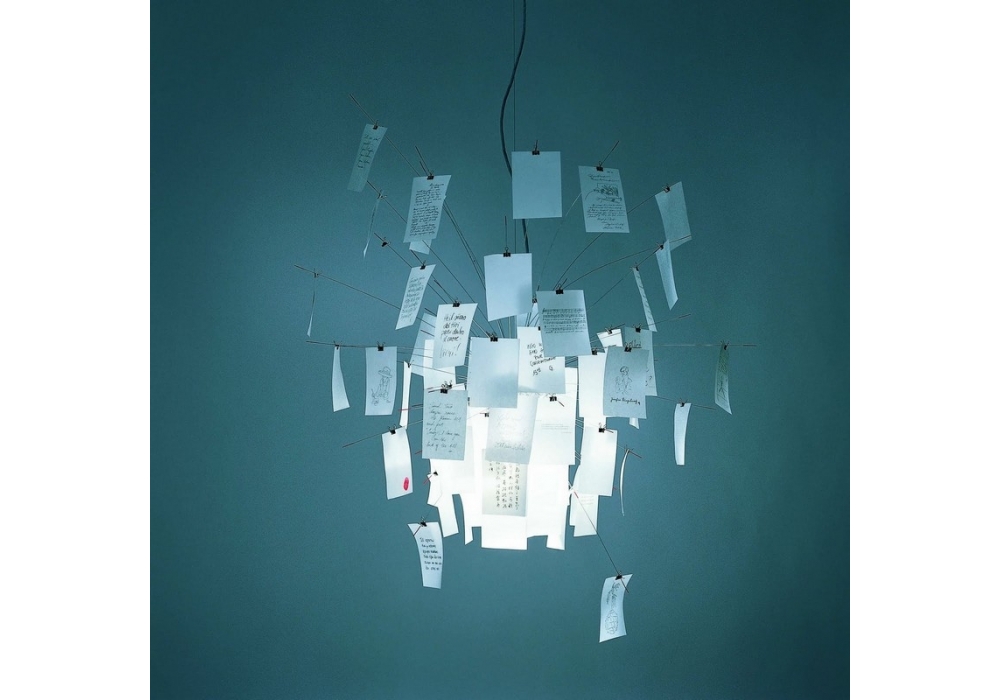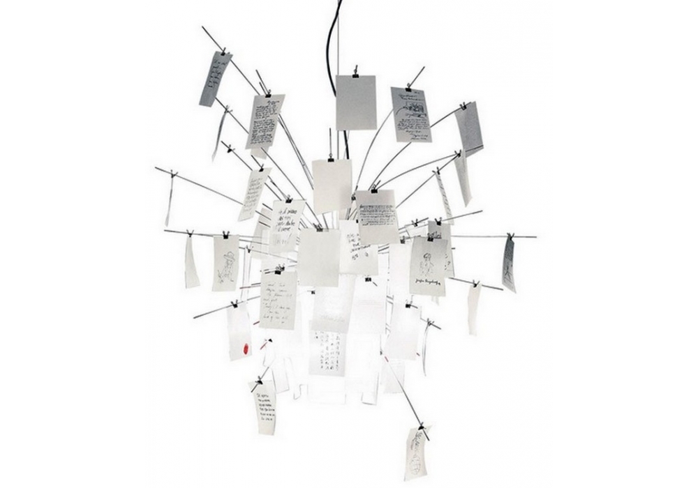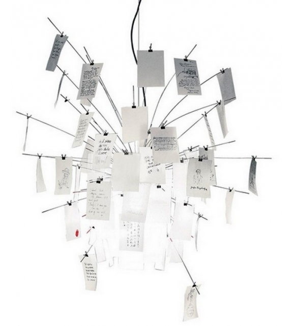 Zettel'z 6 conçue et produite par Ingo Maurer est une lampe à suspension avec structure en acier inoxydable et verre satiné résistant à la chaleur. Le diffuseur se compose de 40 feuilles pré-imprimées et de 40 feuilles blanches de papier japonais. Les feuilles vierges jointes peuvent être utilisées pour écrire des messages ou des croquis.