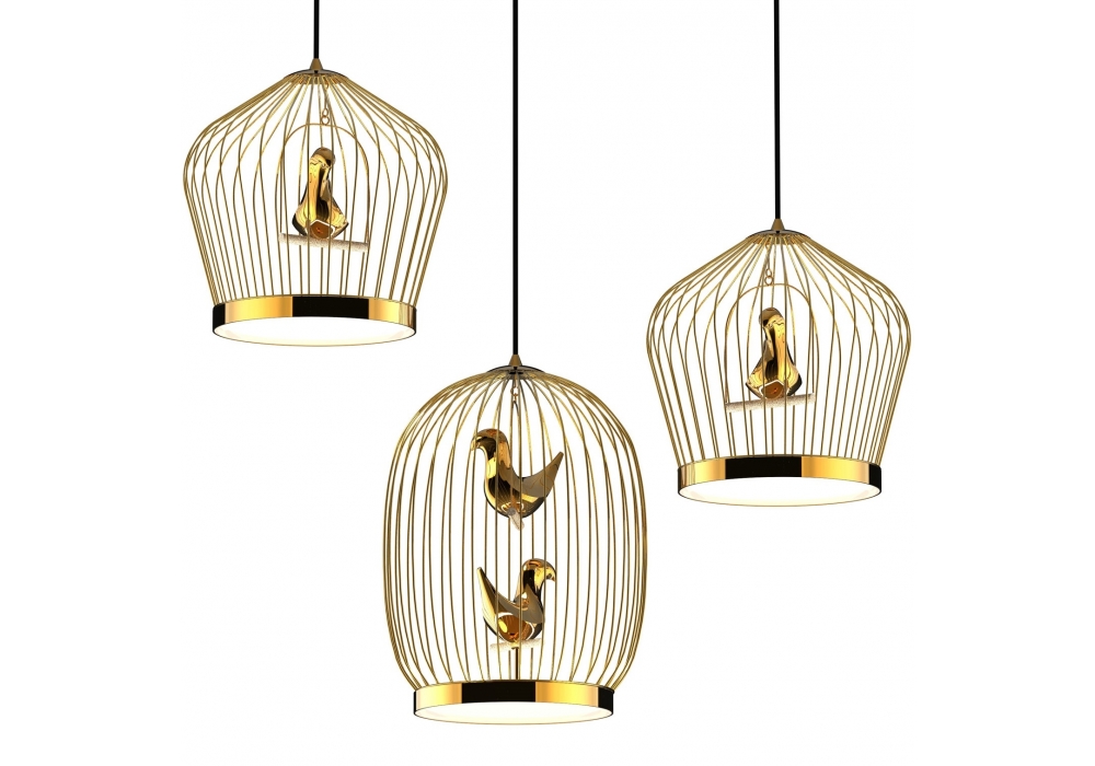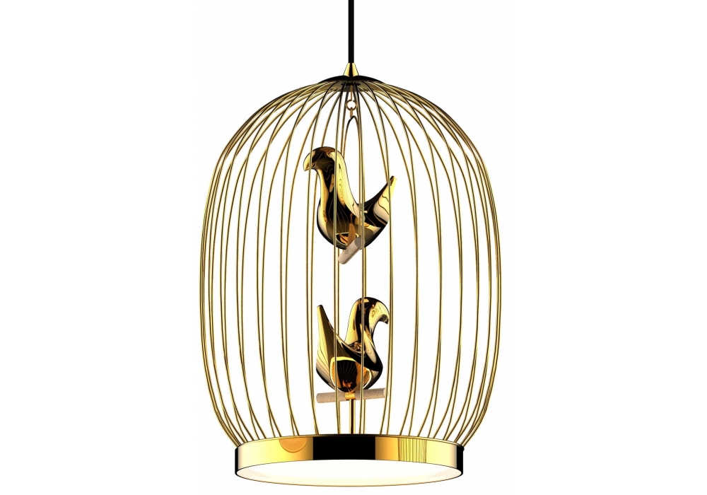 Twee T. conçue par Jake Phipps pour Casamania & Horm est une suspension. Cage à tringles en métal. Petit oiseau en céramique. Le corps d'éclairage LED se trouve dans la base de la cage, recouvert d'un double écran en polycarbonate, qui éclaire l'environnement d'un côté et l'intérieur de la cage de l'autre.