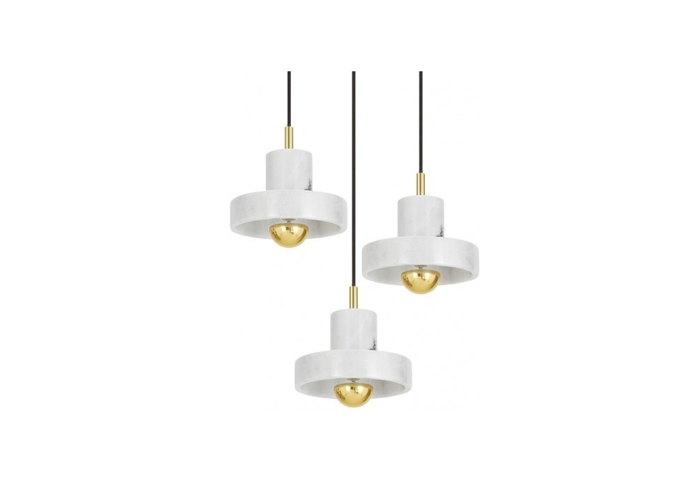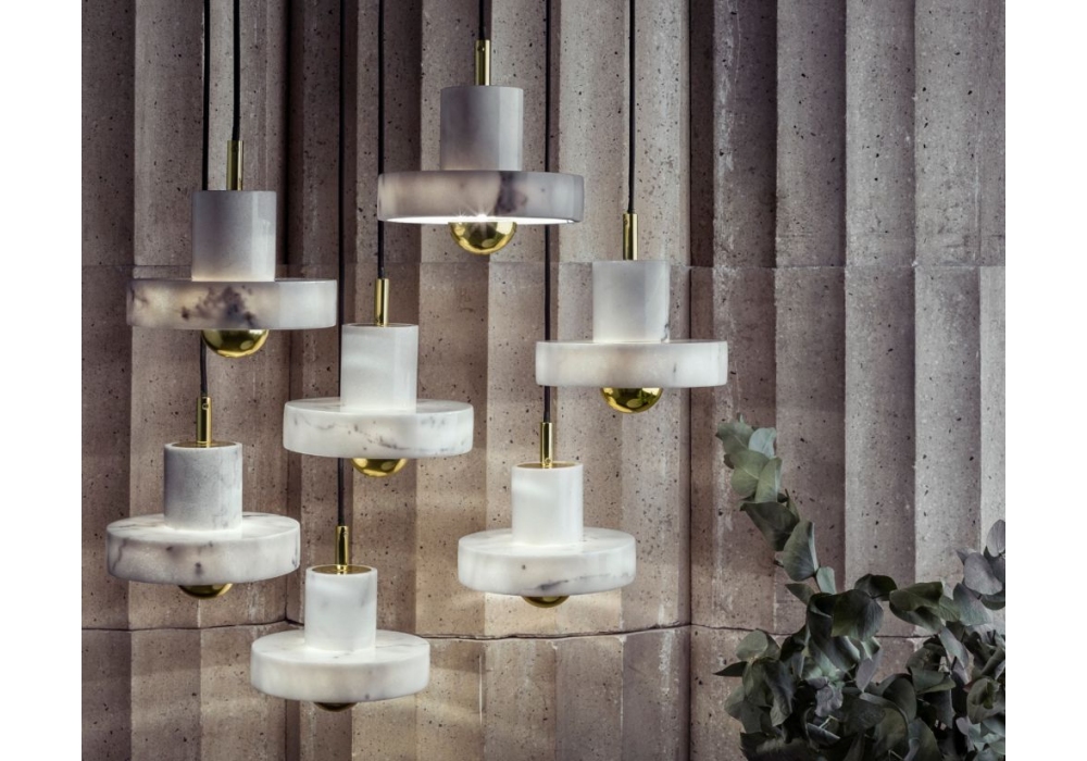 Stone Pendant conçu par Tom Dixon est une suspension en marbre et couronne en laiton. Câble en tissu noir.