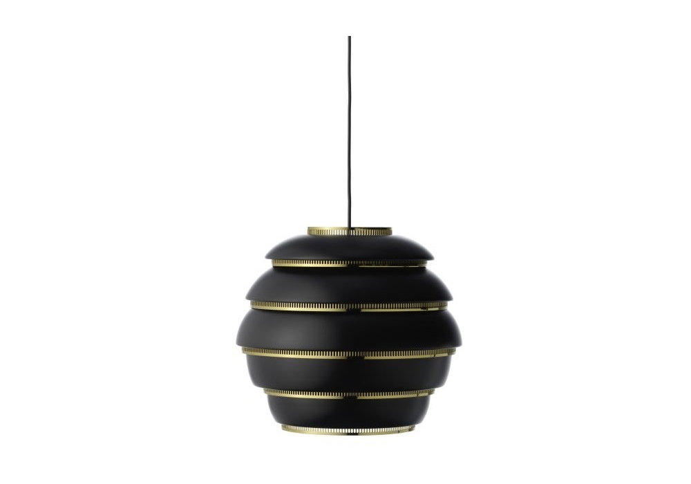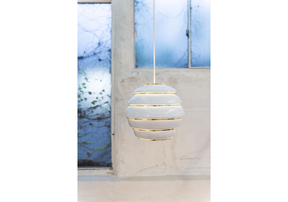 The A331 Pendant Lamp, designed by Alvar Aalto for Artek, signature shape consists of white aluminium shade and polished brass plated steel rings that filter the light in the most beautiful manner. The elegant Beehive is a tasteful addition to any room.