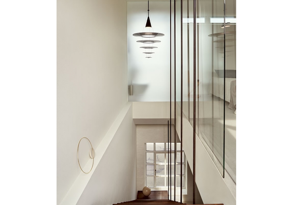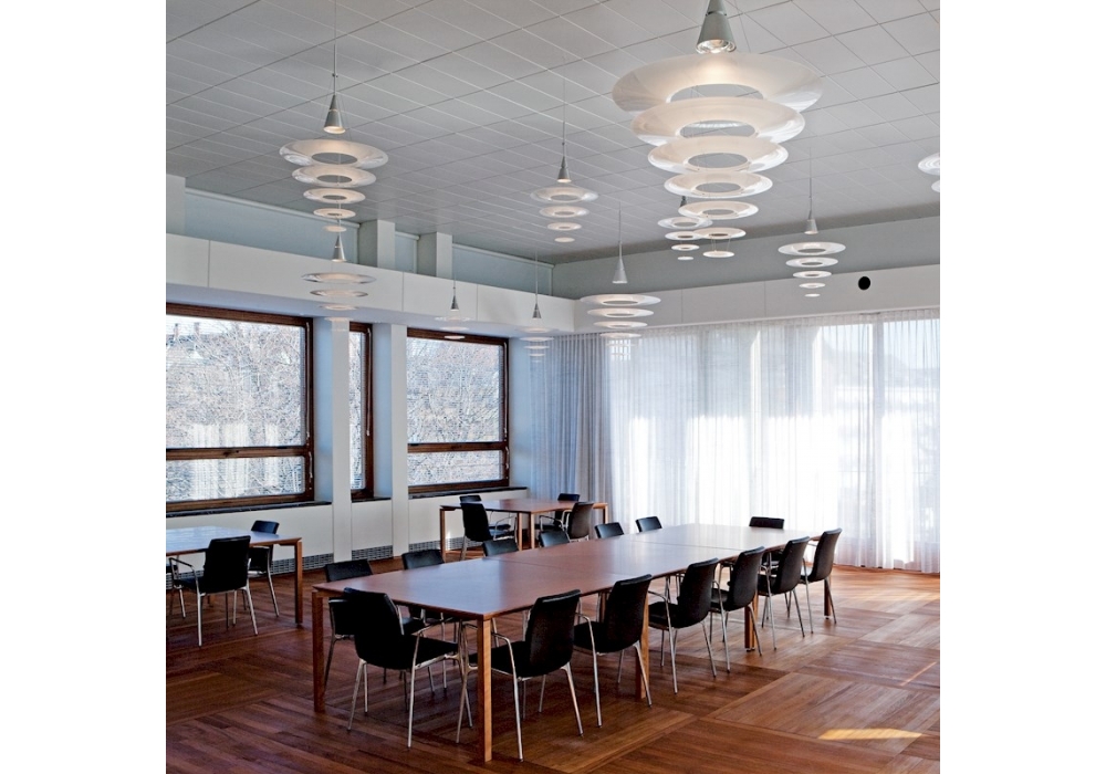 Enigma 425 conçue par Shoichi Uchiyama pour Loius Poulsen est une lampe à suspension avec structure et corps de lampe en aluminium peint en noir. Les écrans réfléchissants sont des cercles concentriques en acrylique blanc ou noir et masquent une source lumineuse de type LED ou halogène GU10. Enigma 425 est disponible en différentes finitions.
