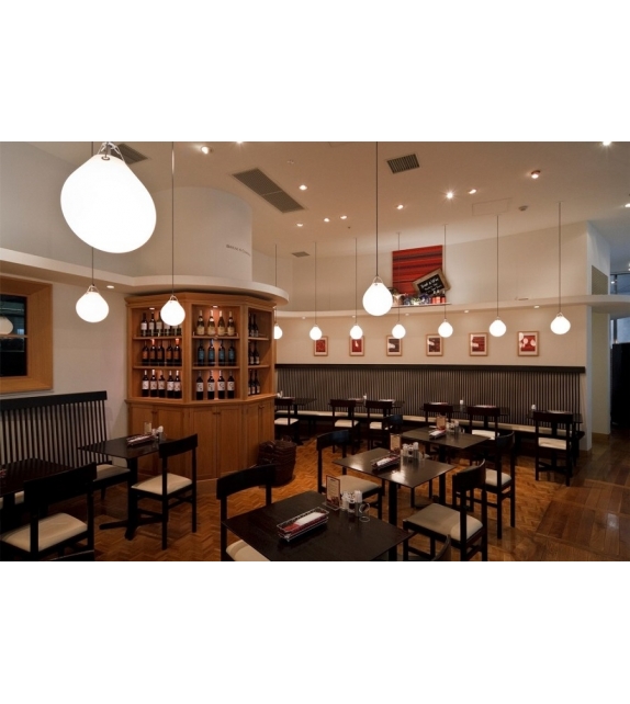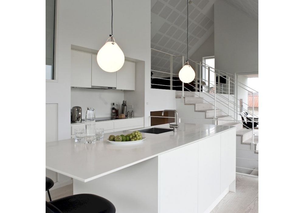 Moser conçue par Anu Moser pour Louis Poulsen est une lampe à suspension avec structure portante en aluminium poli. Le diffuseur a une forme arrondie en verre oplain blanc et protège une source lumineuse LED ou halogène avec culot E27. Moser est disponible en différentes tailles.