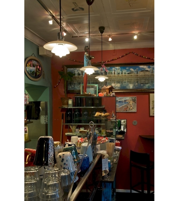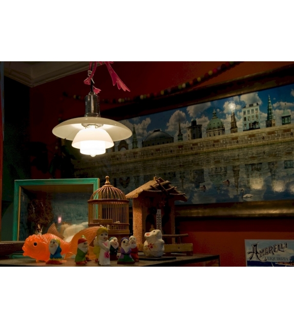 PH 2/1 conçue par Poul Henningsen pour Louis Poulsen est une lampe à suspension avec structure portante en aluminium repoussé. Les diffuseurs sont circulaires en verre blanc soufflé blanc et abritent une source lumineuse LED ou halogène avec culot E14. PH 2/1 est disponible en différentes finitions.