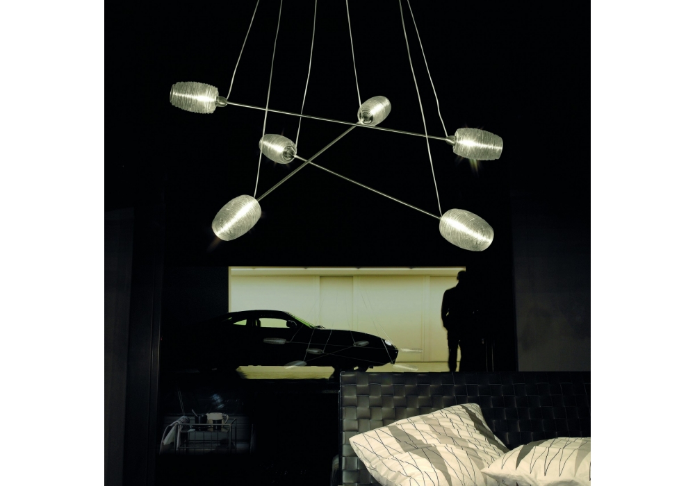 Damasco conçue par Paolo Crepax pour Vistosi est une lampe à suspension avec structure portante en métal peint couleur nickel. Le diffuseur est en cristal avec une surface irrégulière en deux couleurs différentes cristal/ambre ou cristal et adopte une source lumineuse avec douille G9 ou E27 dimmable. Damas est disponible en différents modèles.