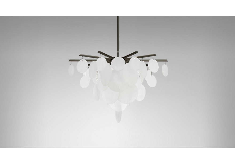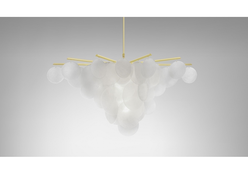 Nimbus conçue par CTO Lighting est une suspension réalisée avec une structure en laiton satiné ou en bronze et des disques de verre semi-finis à la main. Disponible en 3 modèles.