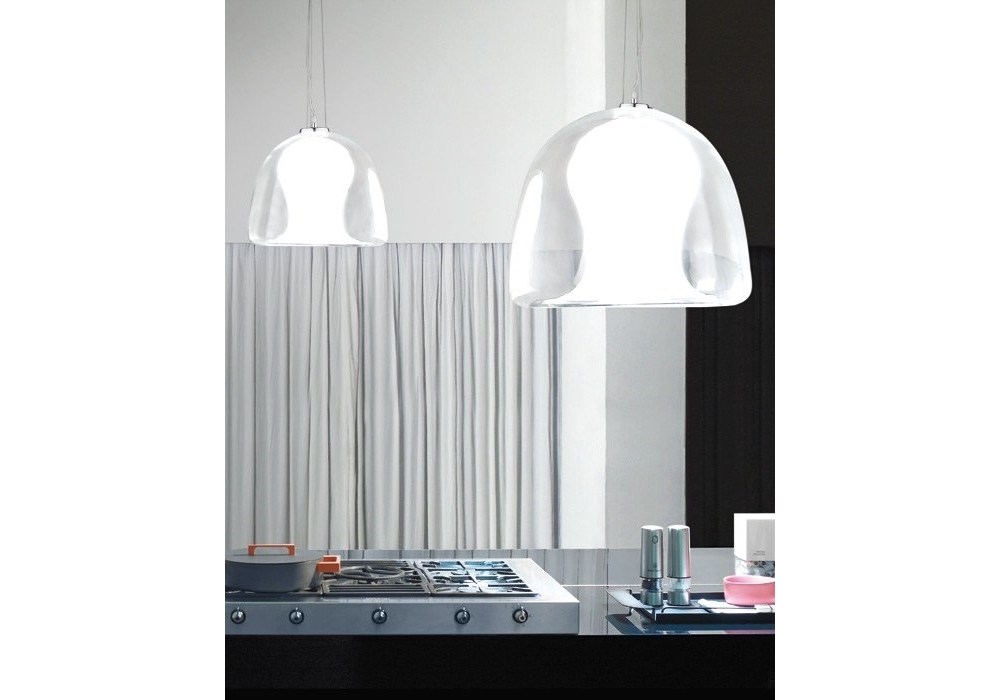 Naranza conçue et produite par Visori est une lampe à suspension avec structure portante en métal chromé. Le diffuseur est en forme de cloche en verre transparent brillant et protège une source lumineuse LED ou halogène dimmable. Naranza est disponible en différents modèles.
