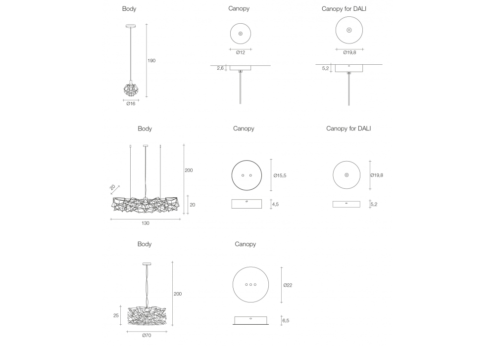 | Plafond rose | Ø12 x H 2,6 cm o Ø 19,8 x H 5,2 cm(Dali); Ø15,5 x H 4,5 cm o Ø19,8 x H 5,2 cm (Dali); Ø22 x H 6,5 cm. |