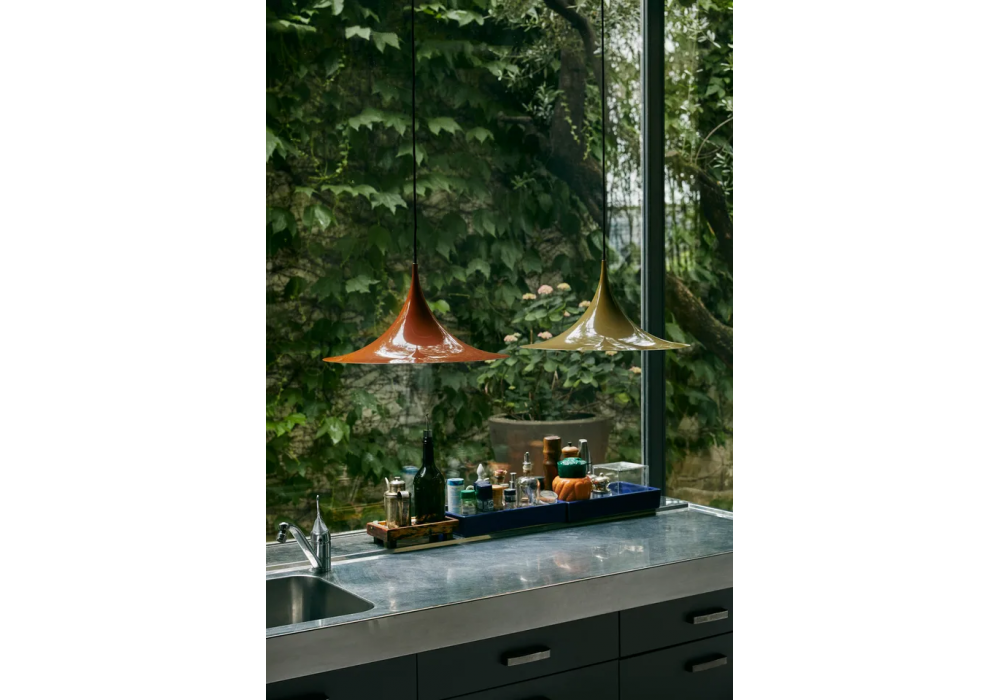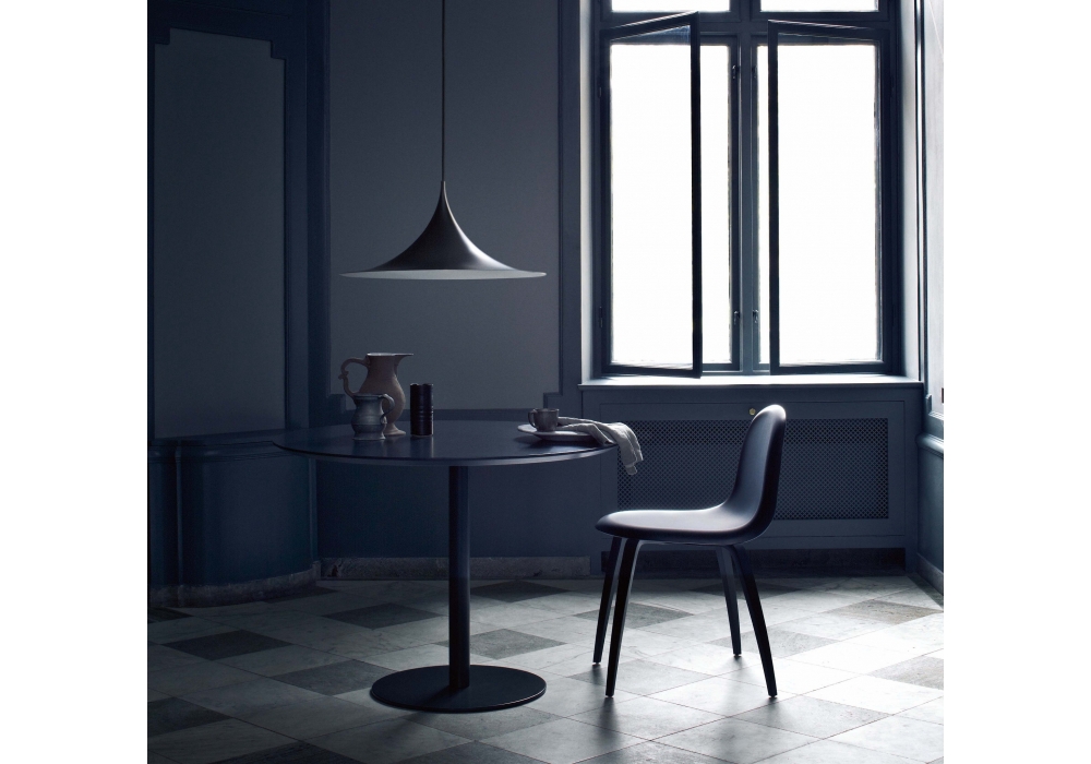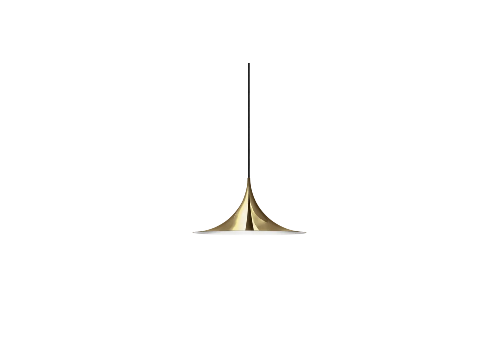 Semi Pendant conçue par Bonderup & Thorup pour Gubi est une suspension avec arc en métal émaillé avec une forme basée sur les deux quarts d'un cercle. Le cordon textile est noir, sauf pour le finition blanc qui correspond à l'abat-jour. Rose de plafond inclus. Ampoule non incluse.