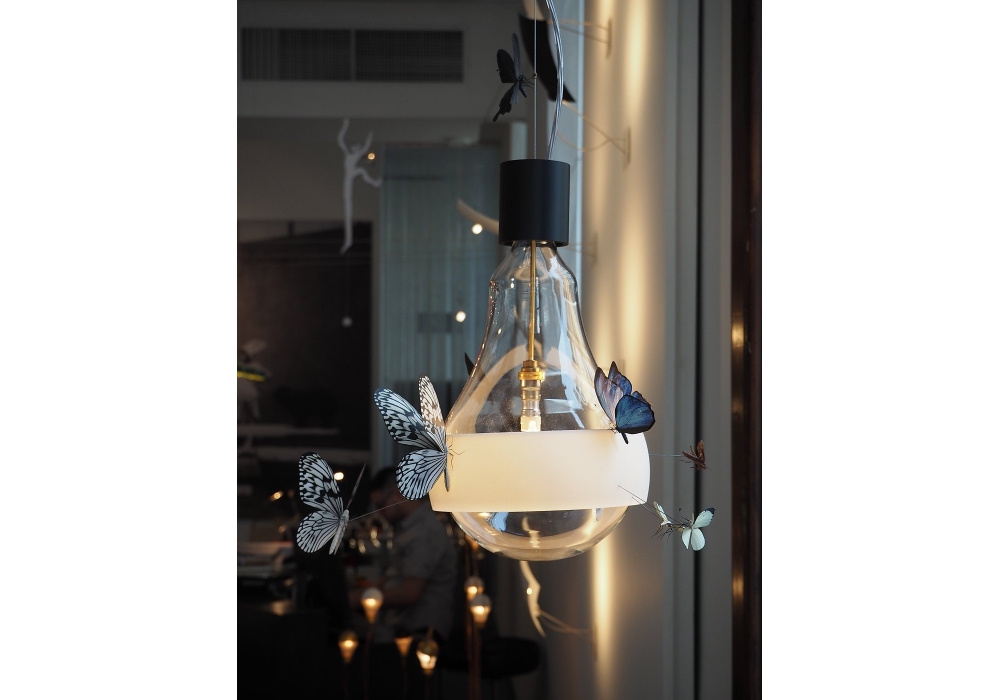 Flatterby designed by Ingo Maurer is a pendant lamp oversized with anti blinding white ring made individually with 3D printing and ten insects handmade models that "buzz" around.