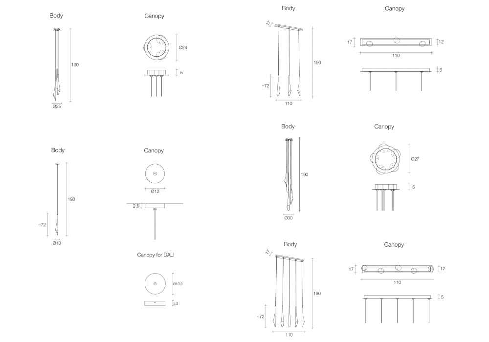 | Dimensions | Ø 13 x H 190 cm (Single) Ø 25 x H 190 cm (3 Round); 110 x 17 x H 190 cm (3 Linear); Ø 30 x H 190 cm (5 Round); 110 x 17 x H 190 cm (5 Linear). |