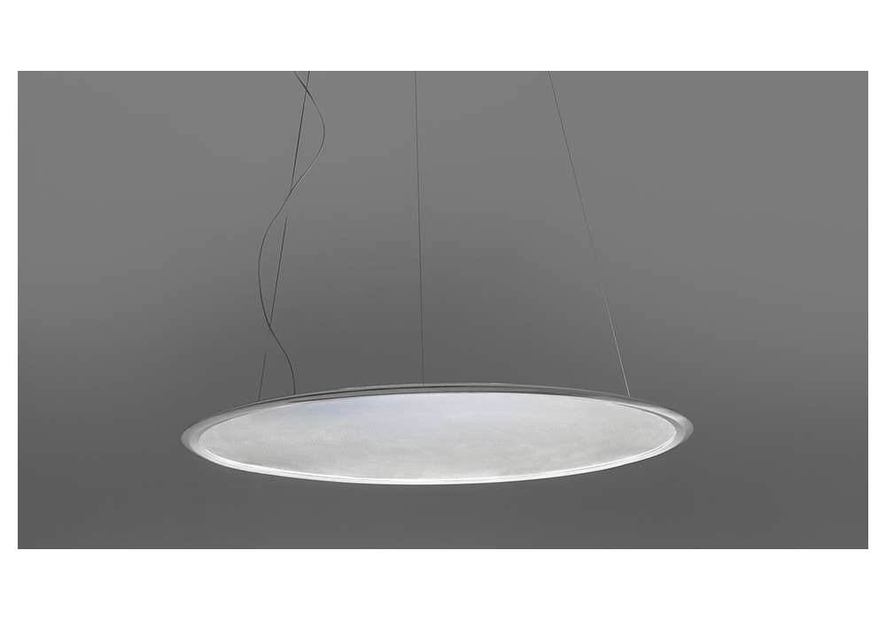 Discovery conçue par Ernesto Gismondi pour Artemide est une lampe à suspension avec structure circulaire en aluminium satiné et peint. Le diffuseur est une feuille de technopolymère transparente obtenue à partir d'une micro-gravure laser. La source lumineuse adoptée est de type LED avec système de gradation par poussée ou télécommande gérable avec l'application Artemide.