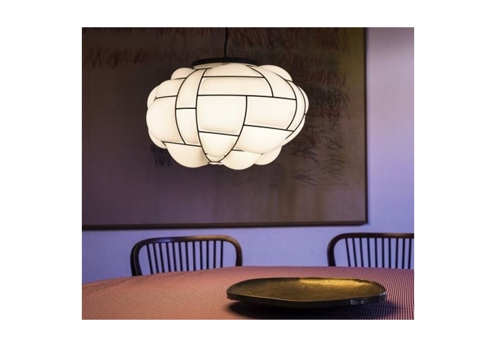 Egg designed by Enrico Franzolini for Pallucco is a beautiful pendant lamp. Its eccentric design which brings back an ancient craft technique, the glass blowing in a cage, to create a luminous, amber and organic. The blowing gives the glass slight irregularities in the shape and tiny bubbles of air which appear to float in the material, making each single creation unique. The exposed metal structure, with its graphic play, gives this lamp a strong personality even when switched off.
