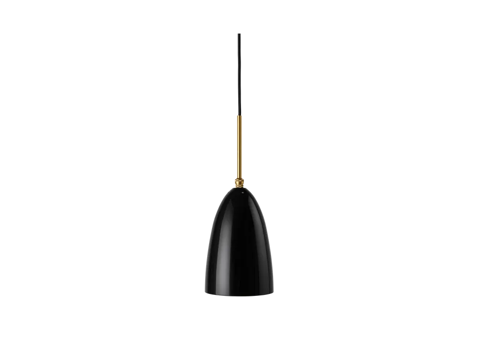 Gräshoppa conçue par Greta M. Grossman pour Gubi est une suspension avec structure en laiton, diffuseur thermolaqué disponible en différentes finitions et câble électrique en tissu. Cette lampe monte le diffuseur conique sur un joint en laiton.