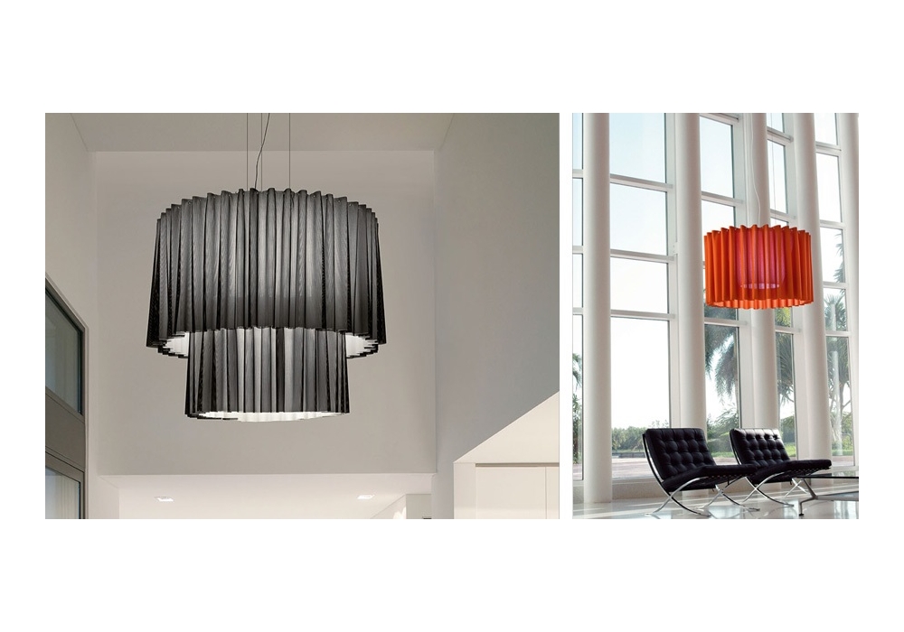 Skirt conçue par Manuel Vivian pour Axo Light est une lampe à suspension avec abat-jour en tissu ignifuge TREVIRA® CS. Disponible en différentes finitions et tailles.