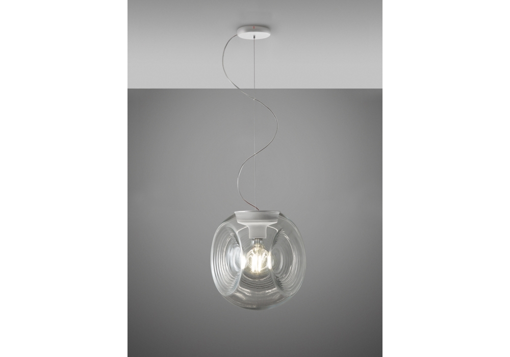 Eyes F34 conçue par Matali Crasset pour Fabbian est une belle lampe de suspension avec diffuseur en verre soufflé transparent ou blanc. Structure en métal verni blanc. Indice de protection IP 20.