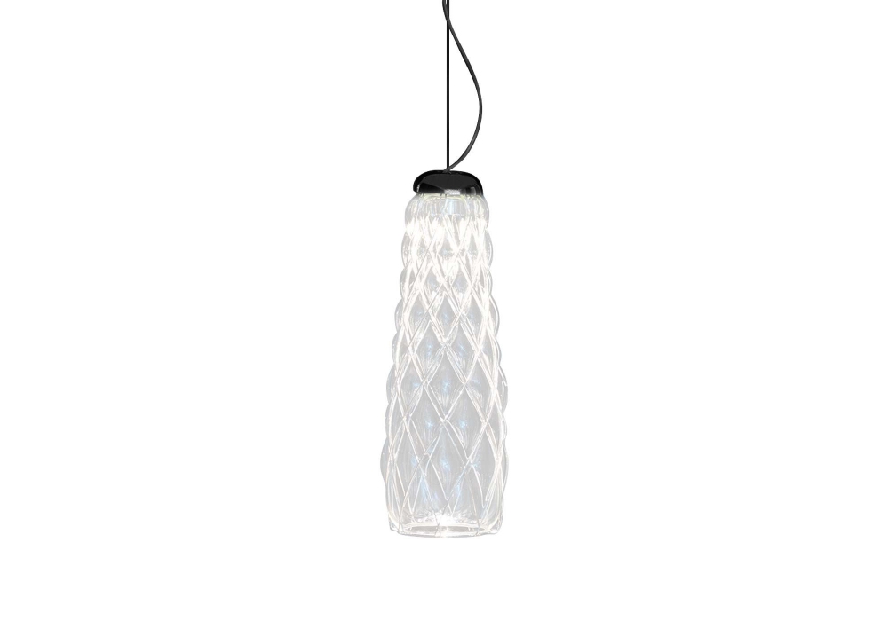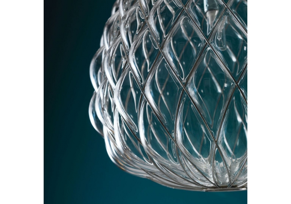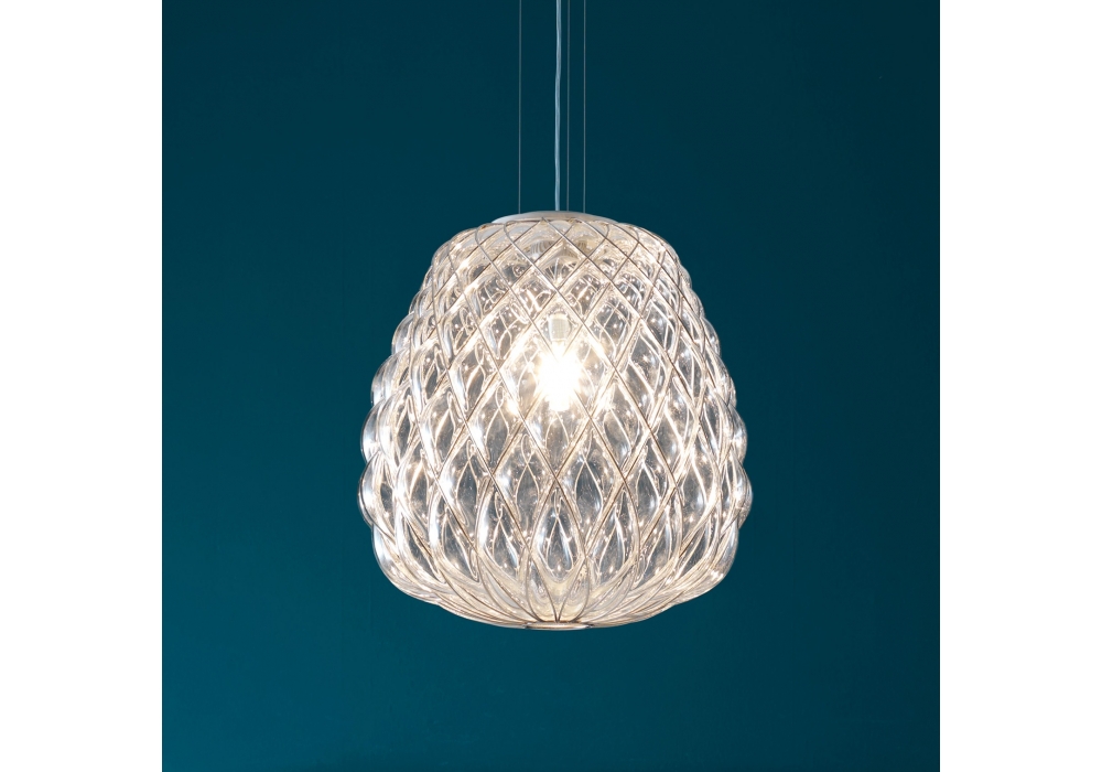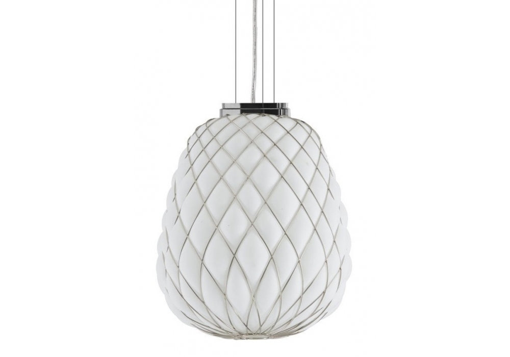 Pinecone conçue par Paola Navone pour Fontana Arte est une suspension avec diffuseur en verre soufflé transparent ou blanc laiteux acidé. Cage en métal chromé or plaqué or. Câble d'alimentation transparent. Filins de suspension en acier. Aussi disponible en 3 différents modèles.
